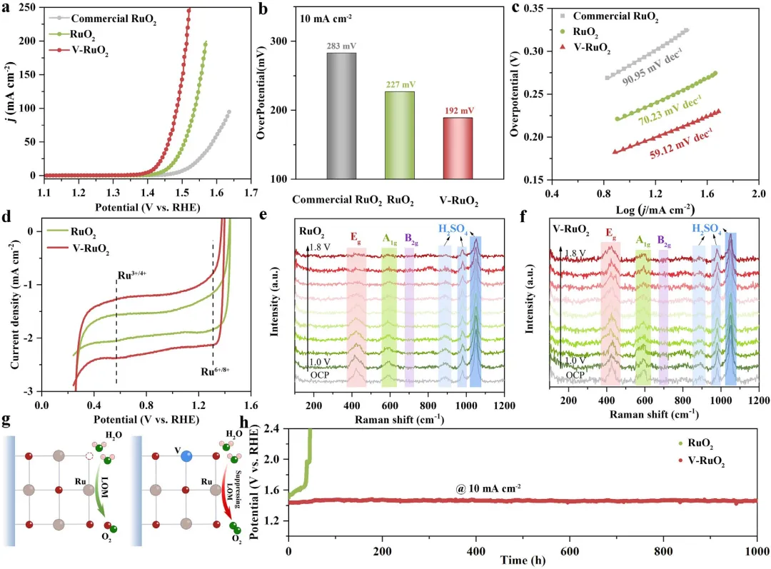 图4 | 商业RuO₂、RuO₂和V-RuO₂的LSV曲线(经iR校正)(a)、在10 mA cm⁻²下的过电位(b)及相应的塔菲尔斜率(c)。(b) RuO₂、RuO₂和V-RuO₂在10 mA cm⁻²下的过电位。(d) RuO₂和V-RuO₂在0.28~1.4 V vs RHE范围内测得的CV分析氧化还原峰。(e, f) RuO₂和V-RuO₂在1.0~1.8 V vs RHE范围内测得的原位拉曼光谱。(g) V-RuO₂在酸性OER中高稳定性的示意图。(h) RuO₂和V-RuO₂在10 mA cm⁻²下的计时电位稳定性曲线。