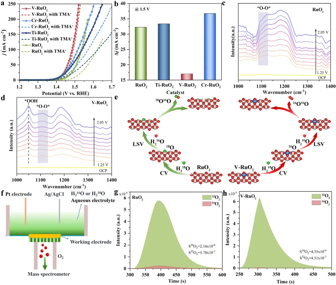 图5 | (a) RuO₂、Cr-RuO₂、Ti-RuO₂和V-RuO₂在添加和不添加TMA⁺时的LSV曲线。(b) RuO₂、Cr-RuO₂、Ti-RuO₂和V-RuO₂在1.5 V vs RHE下添加和不添加TMA⁺的电流密度差值。(c, d) RuO₂和V-RuO₂在1.25~2.05 V vs RHE范围内测得的原位ATR-FTIR谱图。(e) RuO₂和V-RuO₂涉及AEM和LOM路径的DEMS测量示意图。(f) 原位DEMS示意图。(g) ¹⁸O标记的RuO₂和(h) V-RuO₂催化剂在含H₂¹⁶O的0.5 M H₂SO₄电解液中产生氧气的³⁴O₂(¹⁶O¹⁸O)和³²O₂(¹⁶O¹⁶O)的DEMS信号。