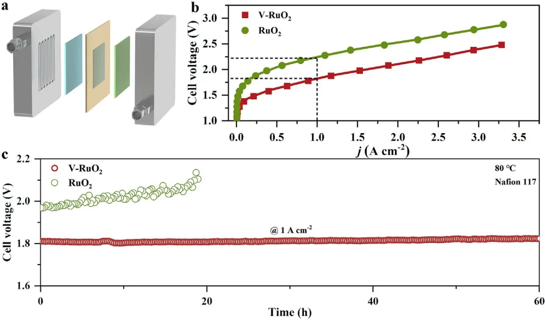 图6 | (a) PEMWE装置示意图。(b) 使用RuO₂或V-RuO₂催化剂作为阳极催化剂、商业Pt/C作为阴极催化剂的PEMWE装置的极化曲线和(c)计时电位曲线。