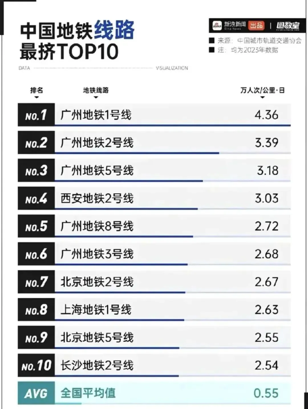 如果看单条的地铁客流强度,拥挤程度排名全国前5的地铁,5条线里面有4条都在广州,可见真实的广州地铁更拥挤。