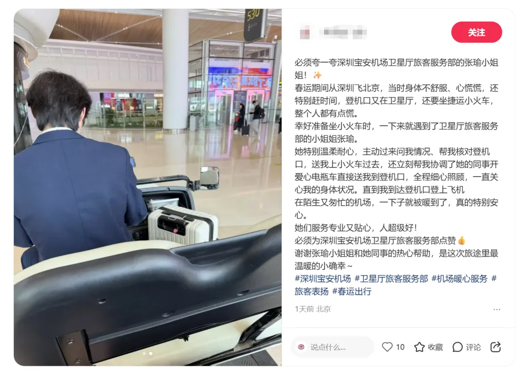“在陌生又匆忙的机场,一下子就被暖到了。”3月25日,一位旅客在小红书上的发帖实名点赞深圳机场工作人员张瑜小姐姐。这位旅客回忆了自己在深圳登机时的经历,身体不舒服叠加时间很赶等因素整个人心惶惶,幸好遇到了贴心的机场工作人员,终于安心又顺利地登机。
