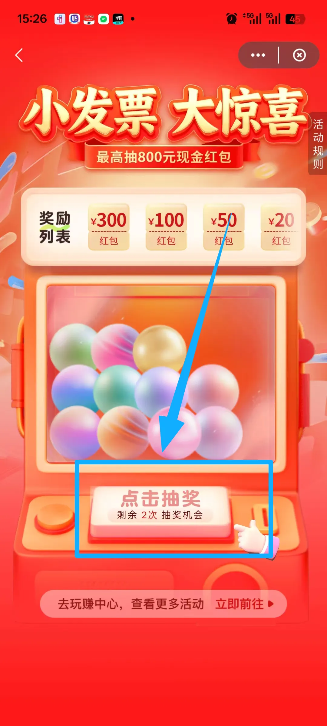 大额红包:100/300/800元;采用即时开奖,延时兑付的方法,即需要等待15天左右,经过系统再次核验发票要求后,就可以兑付红包!