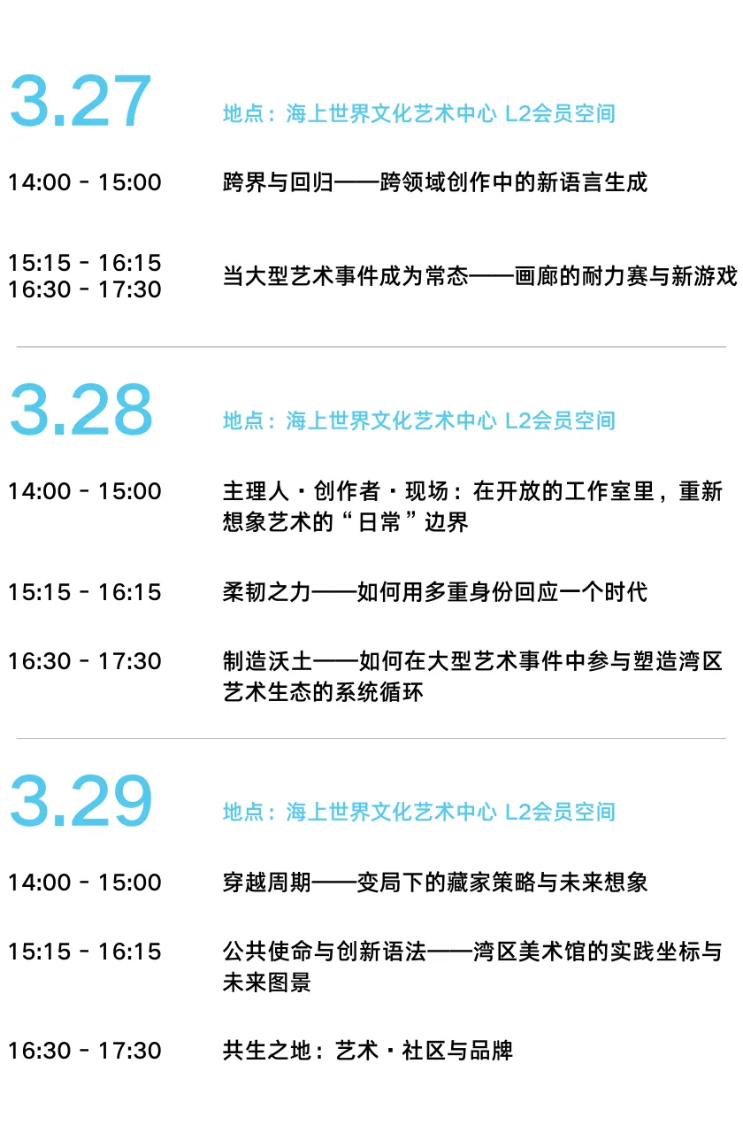 与此同时,「艺术生活」单元中的艺文社区活动、艺术市集及公共美育项目将进一步展开,多个社区空间与品牌联动内容持续呈现;「特别项目」单元中,“So~Shenzhen!”艺博会及相关展览项目也将贯穿艺术周后半程,持续带来艺术资源与在地生态的互动交流。