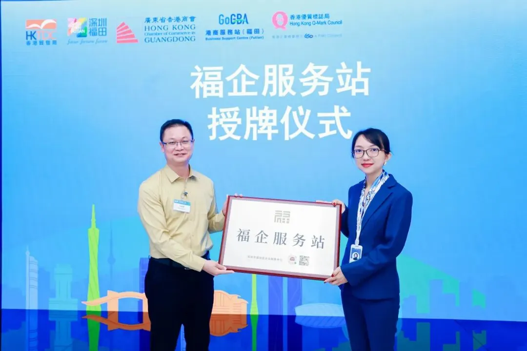 (福田区企业服务中心向GoGBA港商服务站(福田)授予“福企服务站”牌匾,表示对其深耕福田、链接深港资源赋能企业发展成果的认可)