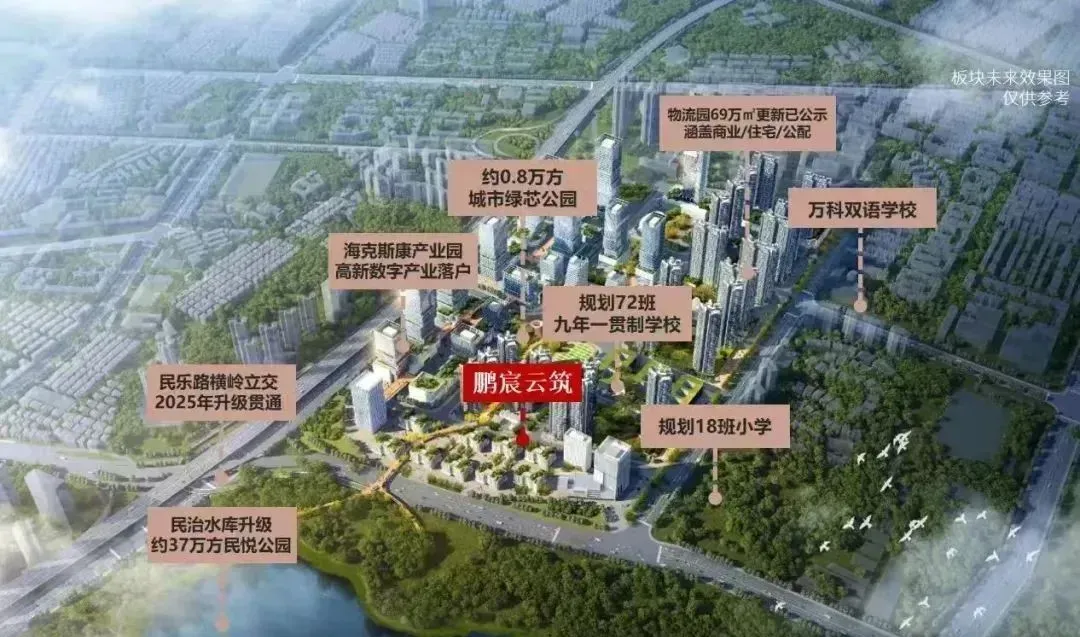 项目所在的港深科创中轴片区定位为千亿级产业规划区,对标深圳湾超级总部基地、腾讯企鹅岛及香蜜湖国际金融中心,是深圳中轴含金量最高的区域之一。周边集聚华南数字超级总部基地、星河World总部基地、坂雪岗科技城、北站产融结合示范区等产业板块,形成数字经济与科技创新的产业高地。作为华南物流园土地整备的首批项目,鹏宸云筑所在的片区将打造超百万平方米产城综合体,涵盖住宅、产业空间及公共配套,未来将吸引海克斯康等企业入驻,推动区域产业升级。