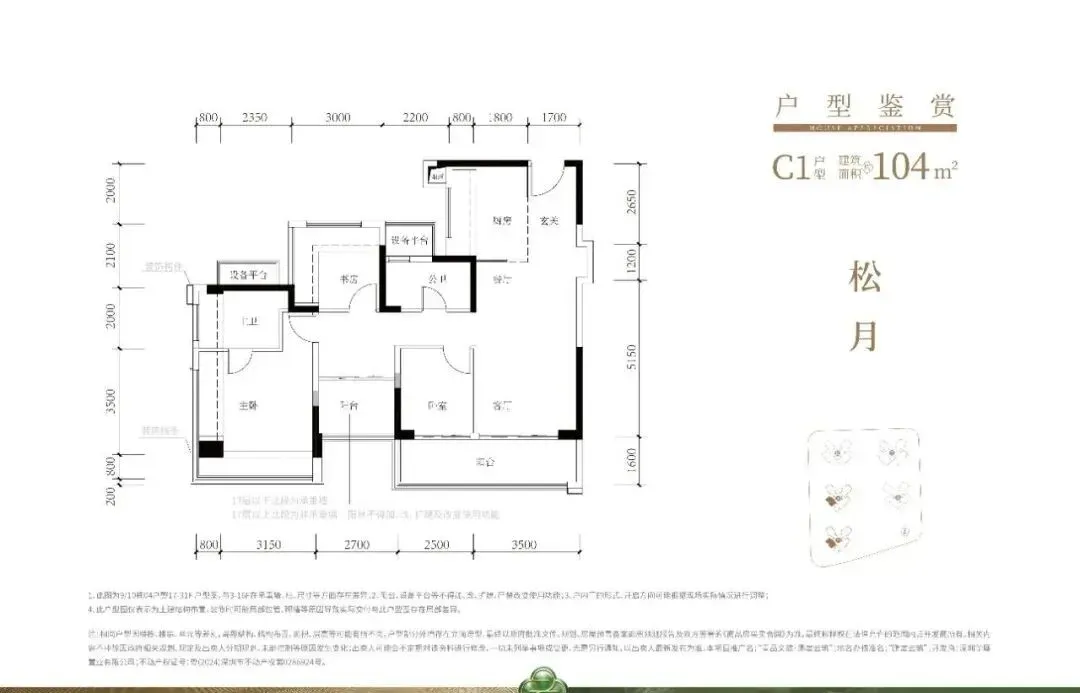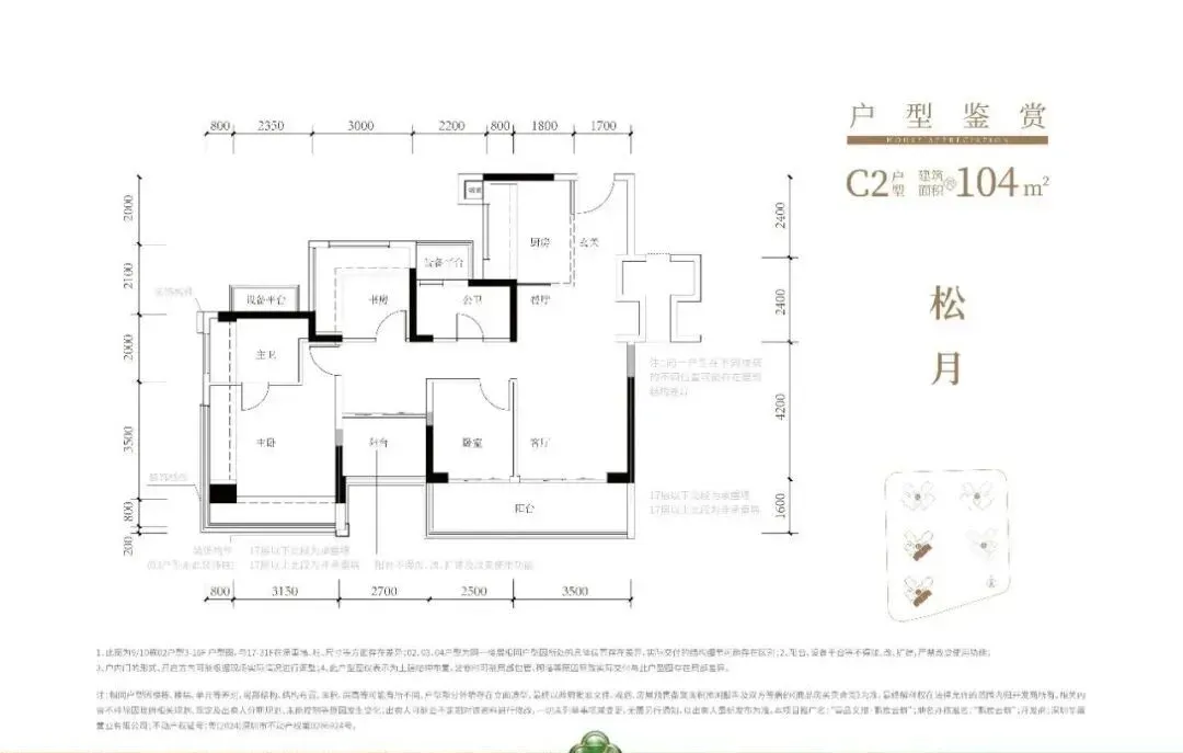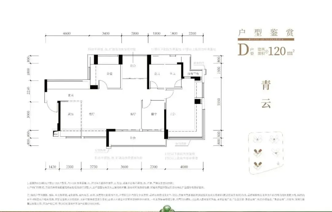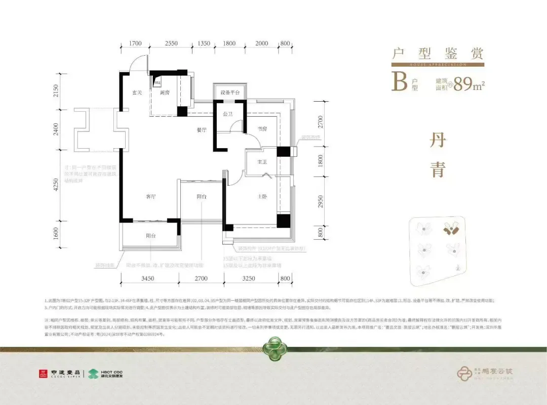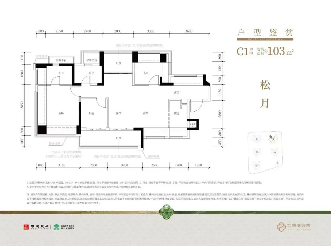 104㎡的4房2厅2卫,C1-C2户型,设计的是经典竖厅格局,进门入户玄关,客厅3.5米开间,LDKB一体化,S墙设计预留冰箱卡槽位,动静分区,四开间朝南,分别做到了主卧17.98㎡/次卧8.37㎡/次卧8.1m²/次卧7.75㎡(包含墙体飘窗),L型厨房,公卫干湿分离带1个约2m²的设备平台,得房率约79.2%(不含赠送),客厅连接次卧出9.6m²的观景大阳台,东南或西南朝向。套内面积82.58m²+赠送面积23.86m²=实用面积106.44m²,加上赠送后得房率约102.04%。120㎡的4房2厅2卫,设计的是横厅南北通透格局,进门赠送约4.6㎡的入户玄关(不计算在户型图内),客餐厅6.35米开间,LDKB一体化设计,分别做到了主卧22.5㎡/次卧11.56m²/次卧9.52㎡/次卧8.25㎡(包含墙体飘窗),主卧带设备平台,客厅连接次卧出6.25米长大阳台,L型厨房,得房率约79.2%(不含赠送),阳台主朝东南向。套内面积94.63m²+赠送面积31.04m²=实用面积125.67m²,加上赠送后得房率约105.13%。鹏宸云筑,位于深圳市龙华区民治街道梅观大道东侧,地处深港科创中轴核心区域,是龙华连接福田中心区的“南大门”,南临福田CBD,北接龙坂传统商业中心,占据城市发展中轴的黄金位置。
