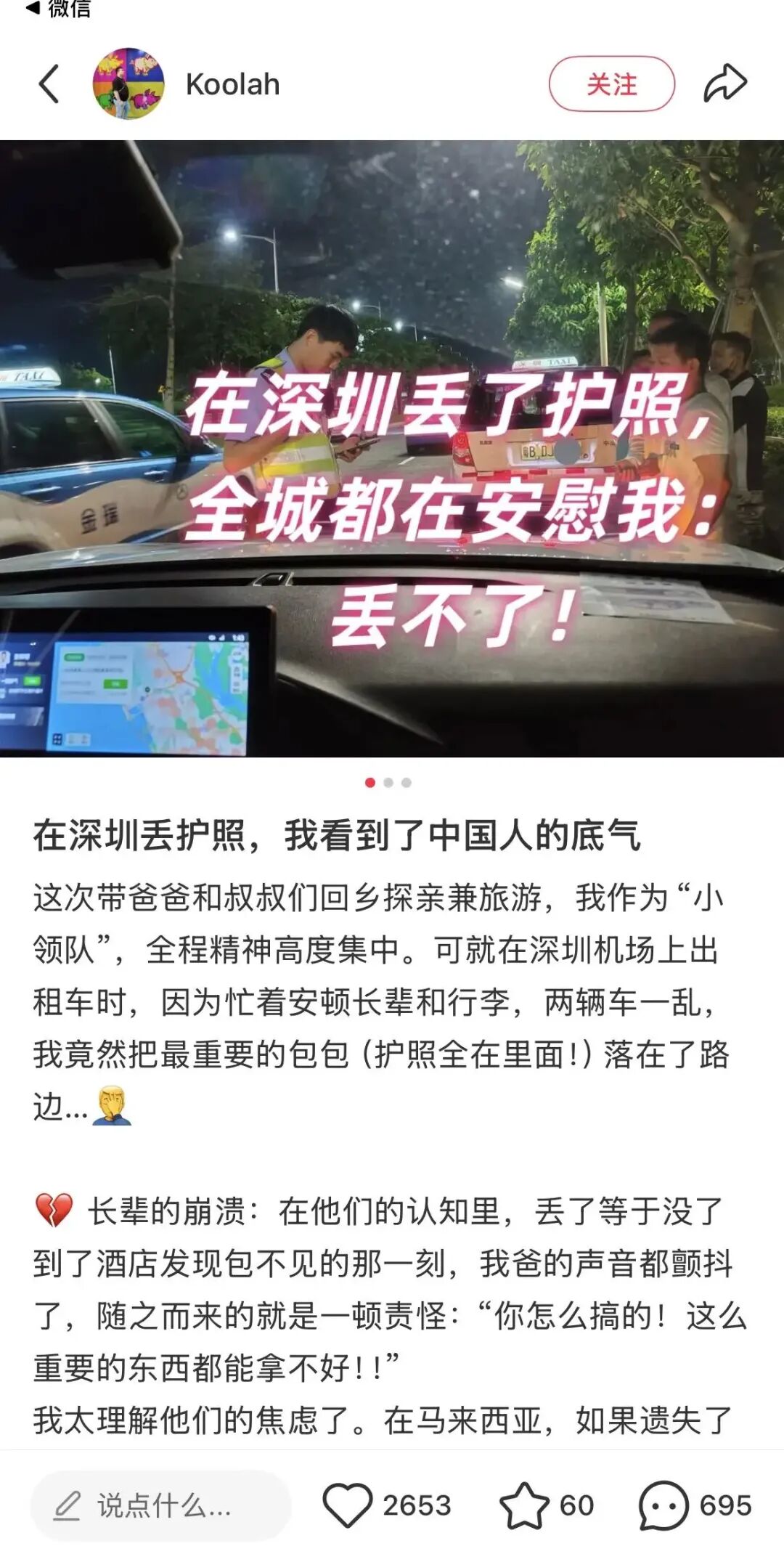 “靓仔,定d黎,在中国丢不了东西的。”3月25日,马来西亚网友“Koolah”分享的一则深圳故事在网上被广为转载。他在帖子里介绍,他来中国旅游丢了放着护照等重要物品的包包,但是他遇到的每个人,都安慰他“丢不了!”这份自信和友善让他非常感动。