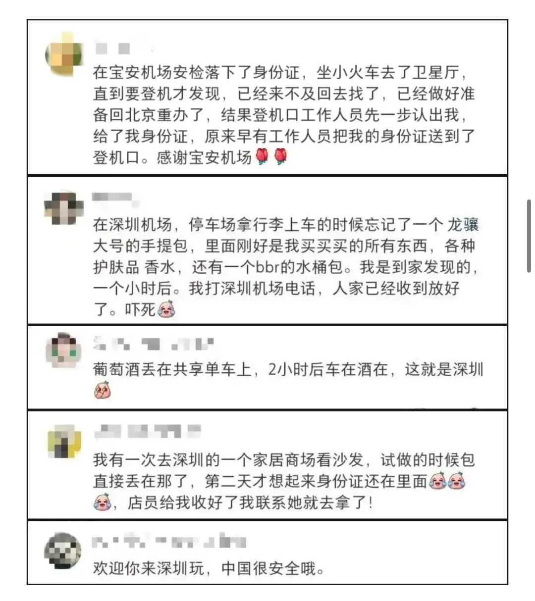 帖子发出后,评论区涌入了大量网友分享自己的“失而复得”经历。有网友留言:“在宝安机场安检落下了身份证,坐小火车去了卫星厅,直到要登机才发现,已经做好准备回北京重办了,结果登机口工作人员先一步认出我,给了我身份证,原来早有工作人员把我的身份证送到了登机口。”