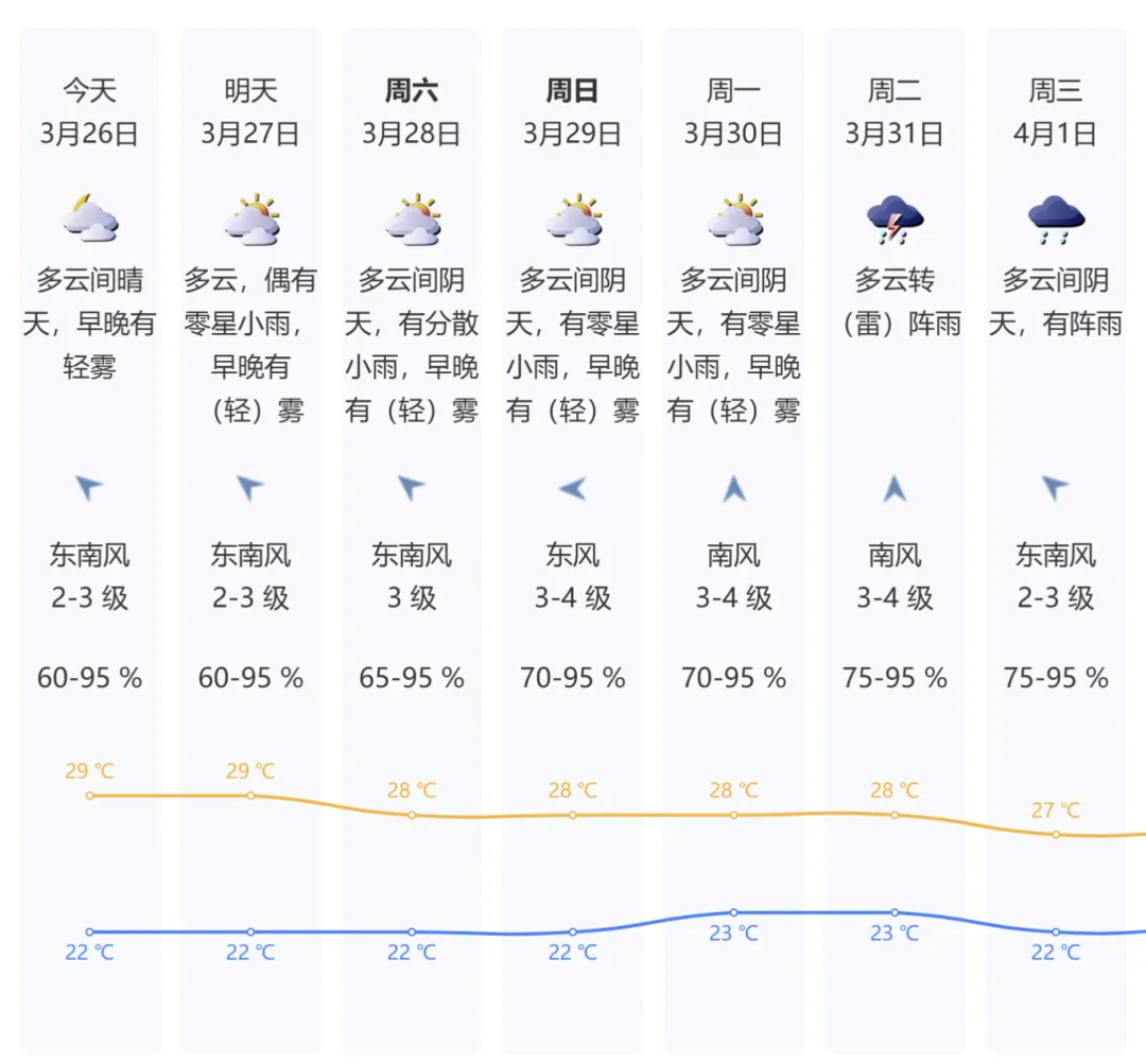 据@广东天气 预计,3月26日,低层西南气流增强,广东大部云量增多,粤北、粤东市县有分散的零星小雨。昼夜温差仍较大,早晚清凉有轻雾或雾。