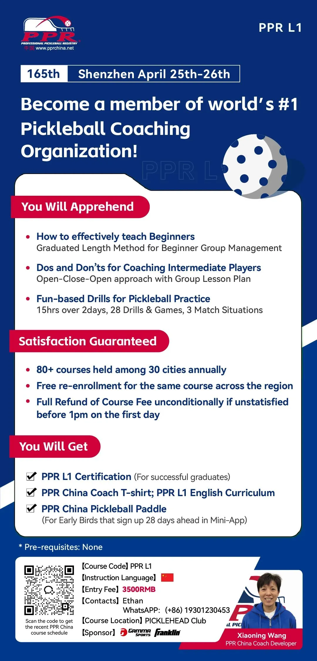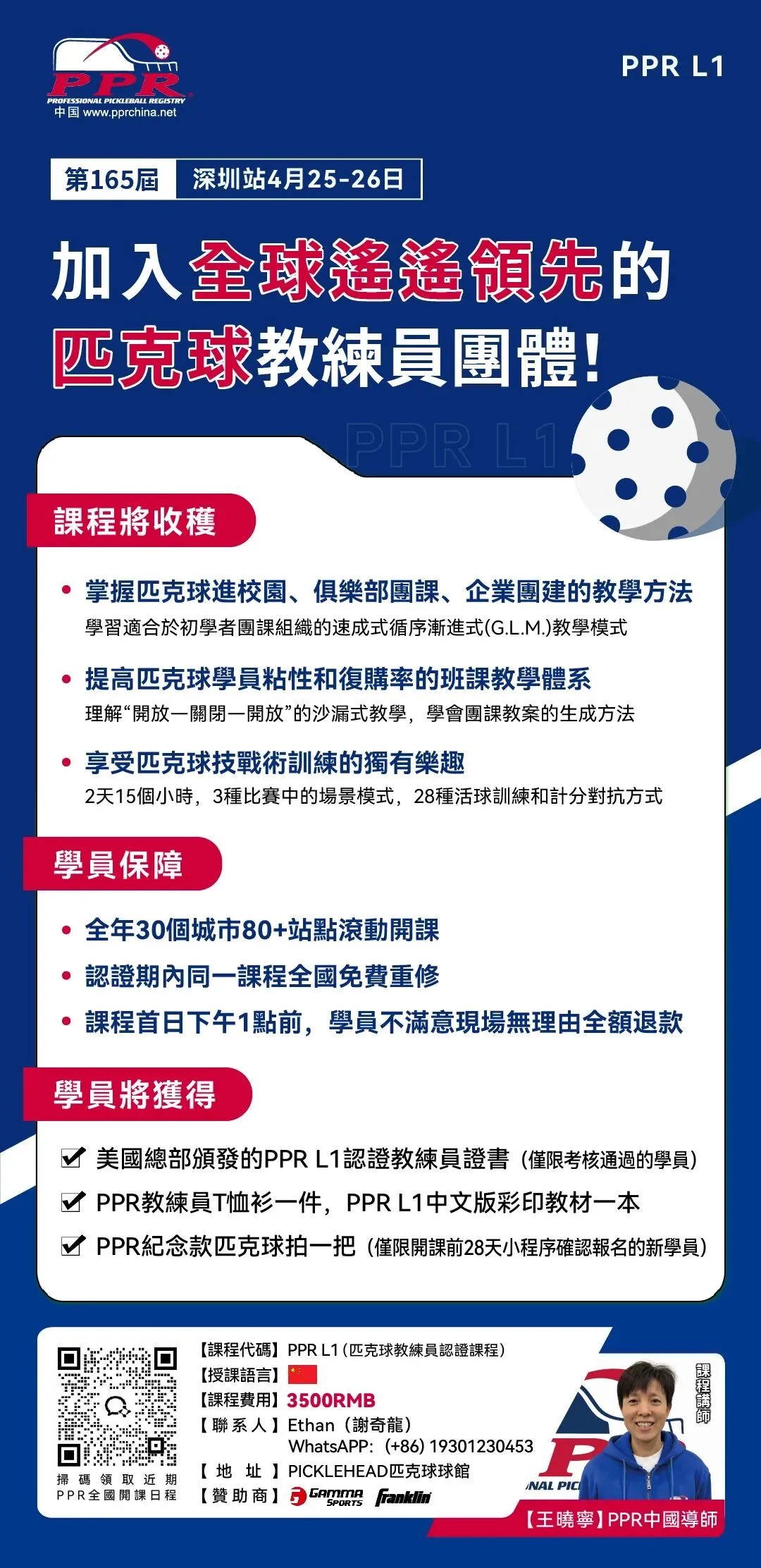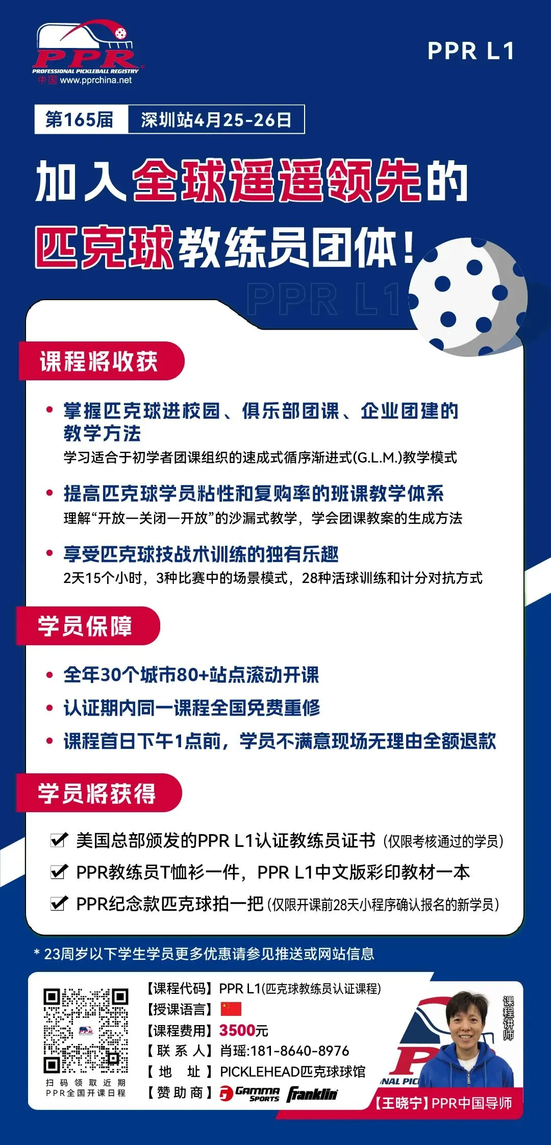2026年4月25日-4月26日,【PPR中国】将与【失焦⽂化传媒(深圳)有限公司】合作,将全球遥遥领先的匹克球教练员组织PPR L1的认证教练员培训课程带到深圳,在未来2天时间内和深圳地区的广大匹克球教练和爱好者们共享匹克球的快乐,期待大家的加入!