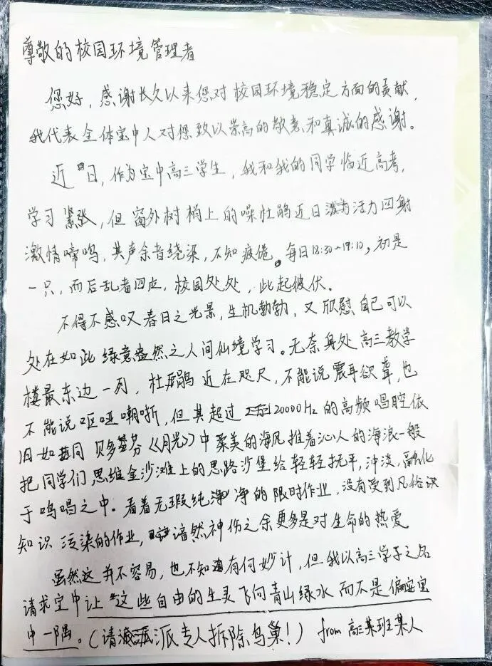 第三,学会与万物对话。你信中那句“请让这些自由的生灵飞向青山绿水”,让我看到了你的善良。但你知道吗?宝中的校园,何尝不也是它们可以栖息的家园?它们选择在这里筑巢,不正是因为这里绿树成荫,是值得托付的地方吗?