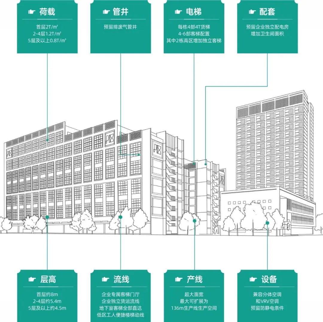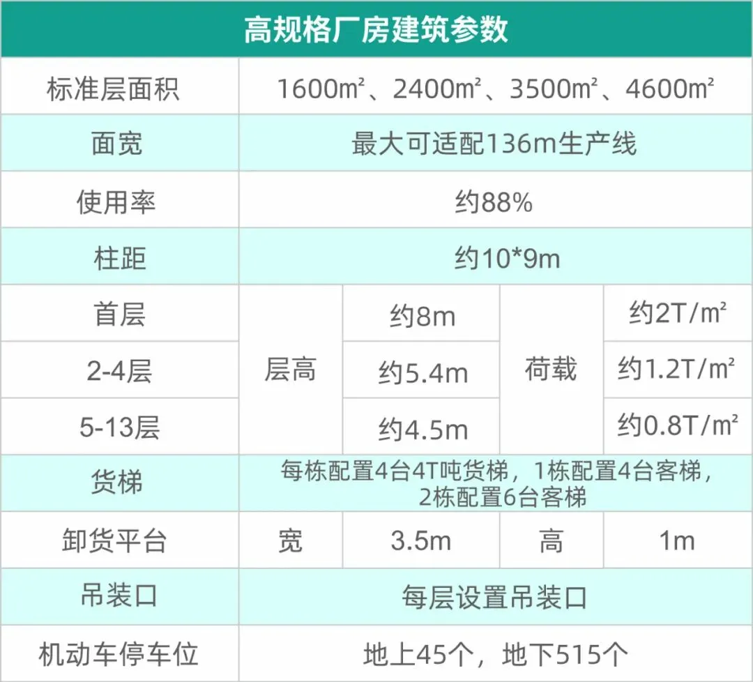 标准层面积2200-4600㎡,首层8m层高,最大可适配136m生产线,10*9m大柱距,4T货梯配置,宽3.5m、高1m卸货平台,货运通路转弯半径12m,大型货车出入无忧。