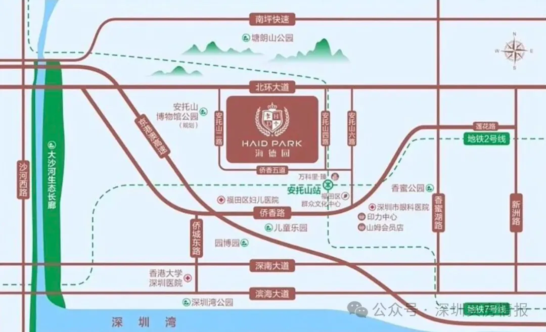 片区,北贴北环大道,东邻为万科臻山府,南边约300米距离地铁2号线与7号线交汇处的安托山站。