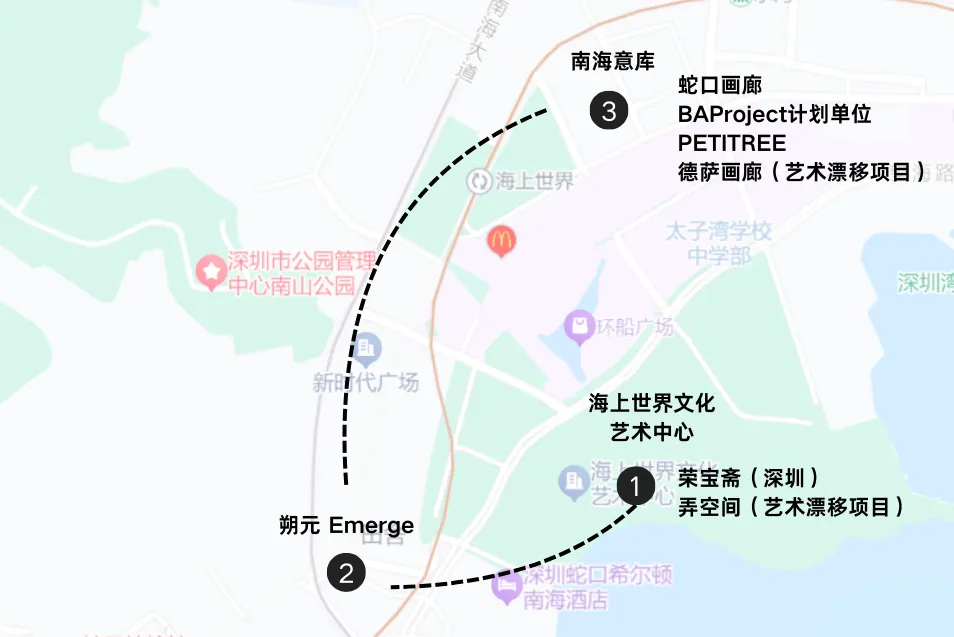 蛇口片区正形成具有国际视野与在地活力的艺术聚落。本漫游路线串联七大空间,融汇了传统与先锋、本土与国际,期望参与者在此深度感受深圳当代艺术生态与城市景观的共生之美 ,在漫步寻美中唤醒灵感,与城市同频发光。