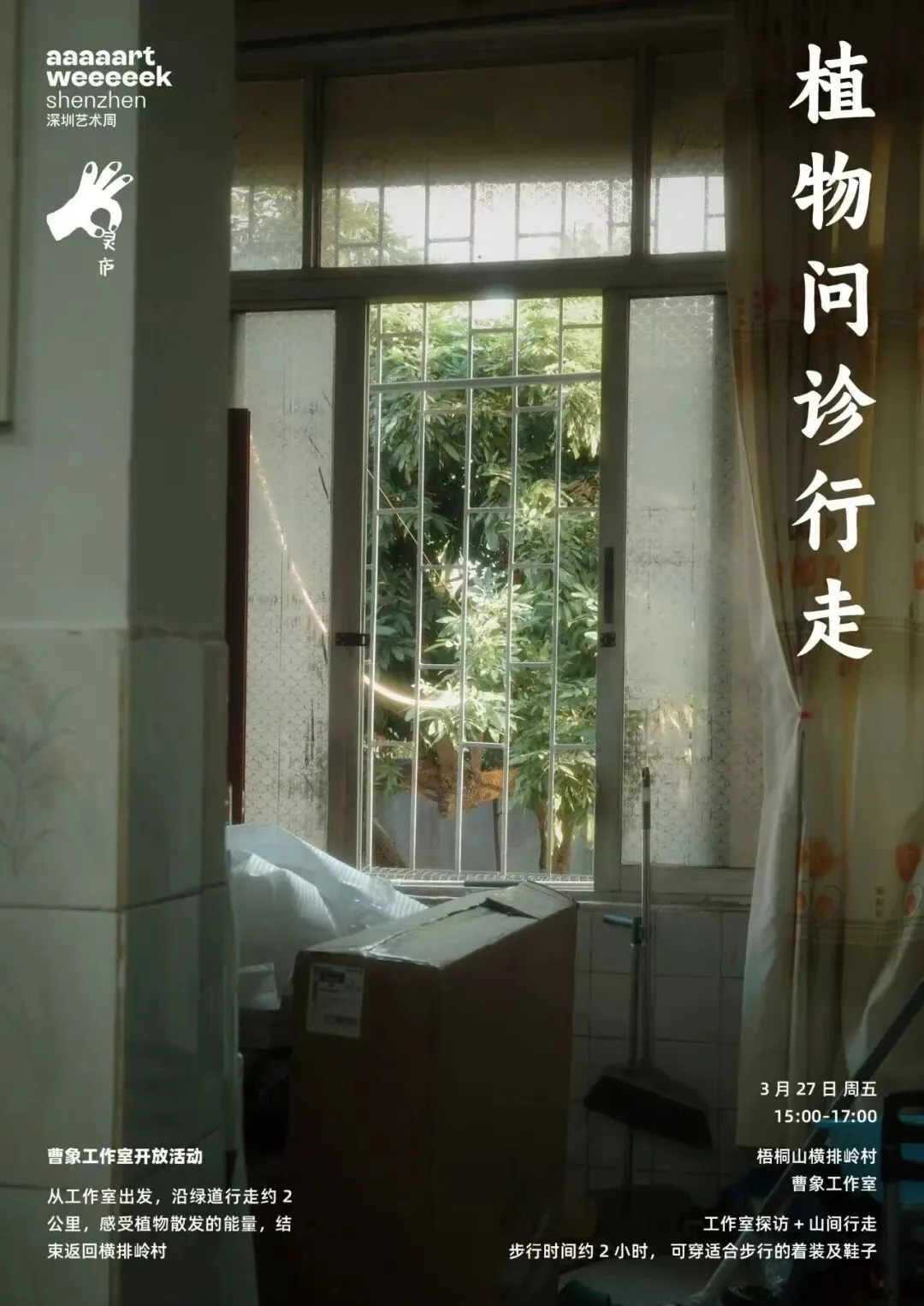 画家曹象的工作室位于梧桐山脚下的村子里,游离于深圳主城区之外,介于自然环境和现代化之间。其工作室呈现了作品背后的生成状态,过程中的灵感有时更能激发对话和讨论。工作室周边的环境也是艺术家的素材拾取库,一些绘画中呈现的场景或对象可以直接在地理环境中被看到。拜访工作室期间还可以参加“植物问诊行走”活动,路线从梧桐山横排岭曹象工作室出发,沿横排岭绿道行走约2公里,感受植物散发的能量。