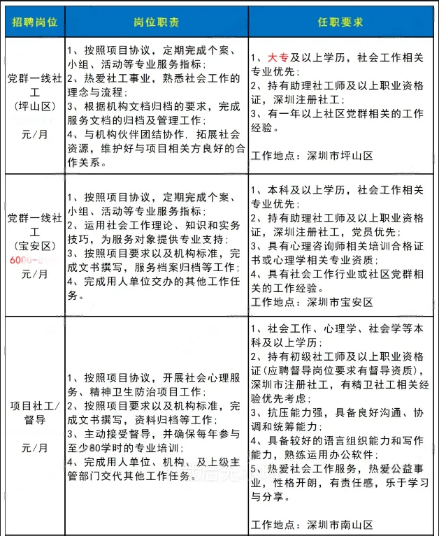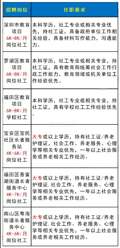 招聘岗位社工、学校社工等,具体要求及薪资范围如下图所示