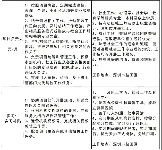 招聘党群一线社工、项目社工/督导、项目负责人、实习生,具体要求如下图所示