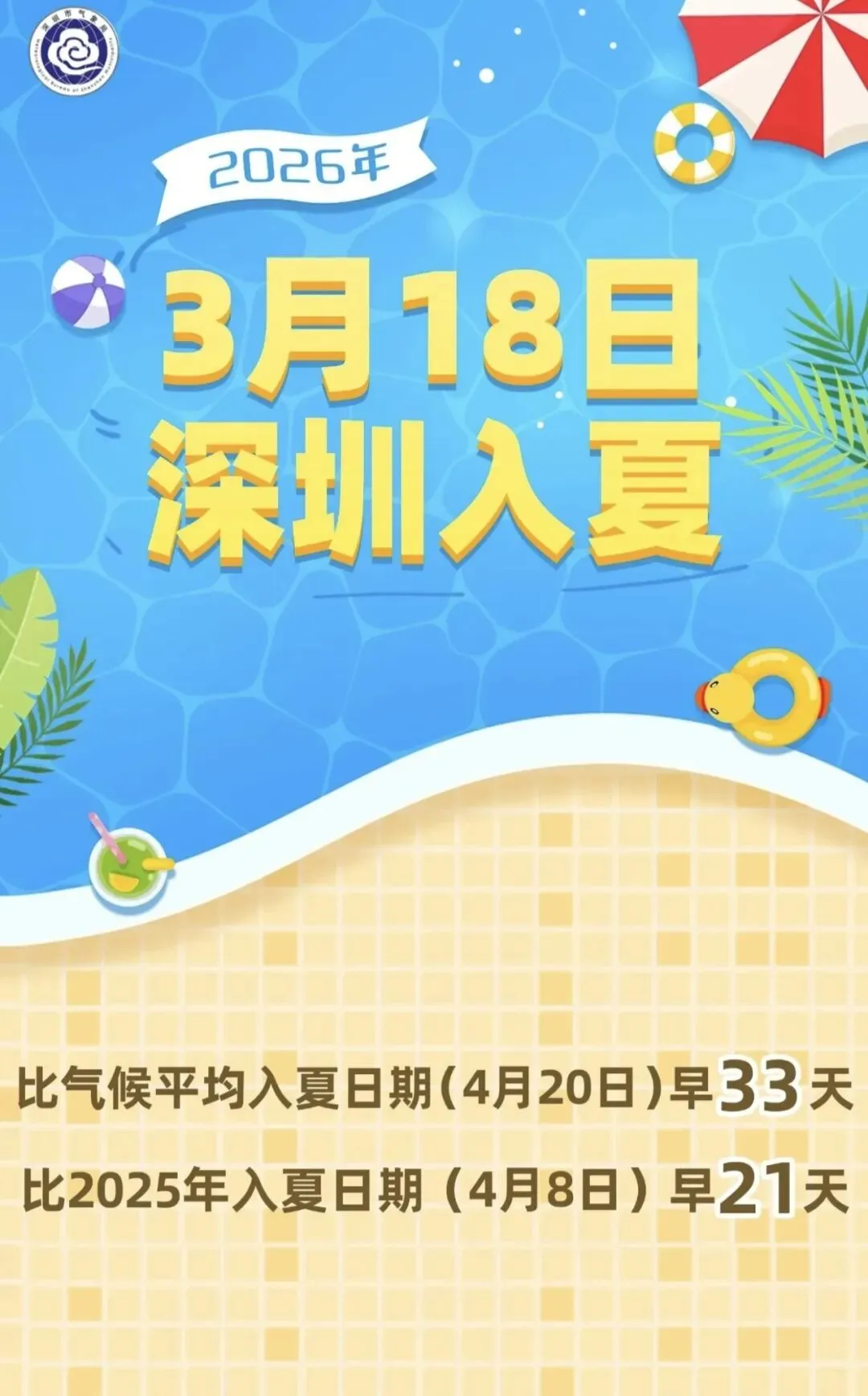 深圳市气象台官方背景的“深圳天气”公众号今天宣布,深圳已于3月18日正式“入夏”。深圳市气象台有记录的最早入夏时间为2024年3月22日,仅仅时隔两年,深圳的最早“入夏”时间再度被刷新。
