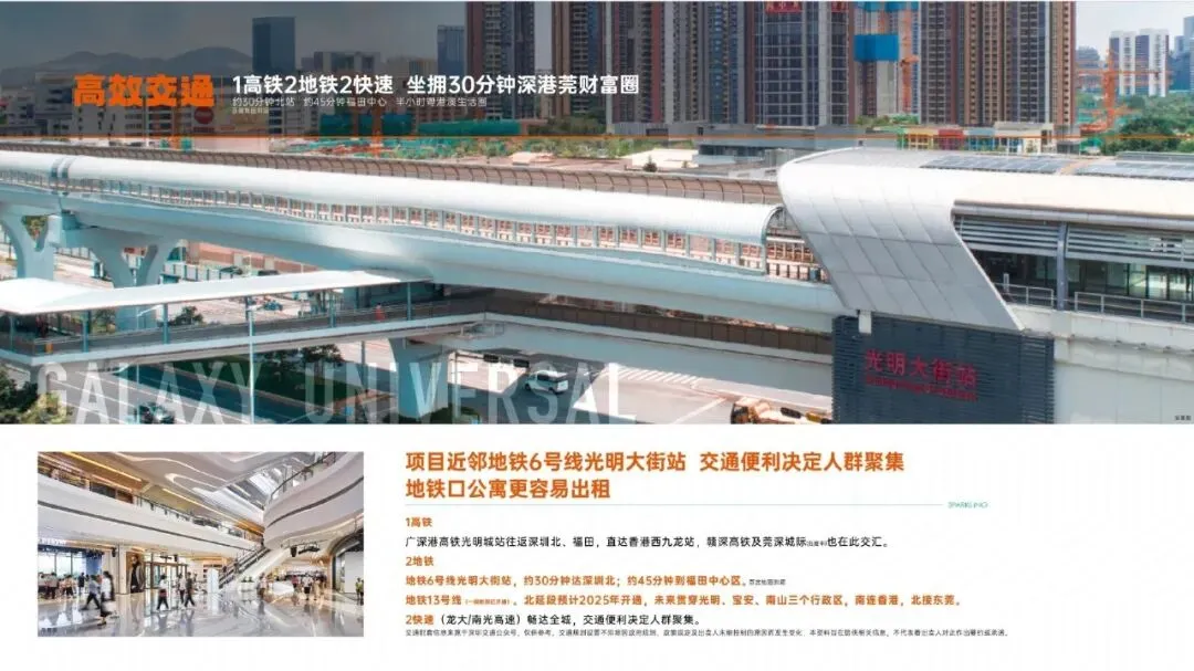 地铁6号线光明大街站,约30分钟达深圳北;约45分钟到福田中心区;