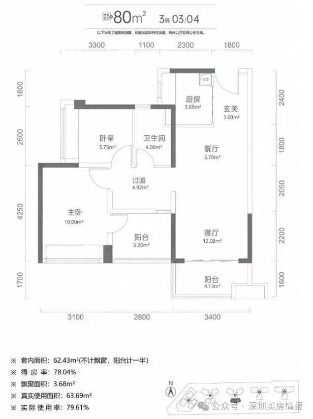 80㎡2+1房一卫:为了偷面积主卧旁设了阳台,实际上就是常规三房一卫户型。餐客厅18.72㎡,客厅开间3.4米,整个动区的观感应该还蛮阔绰。