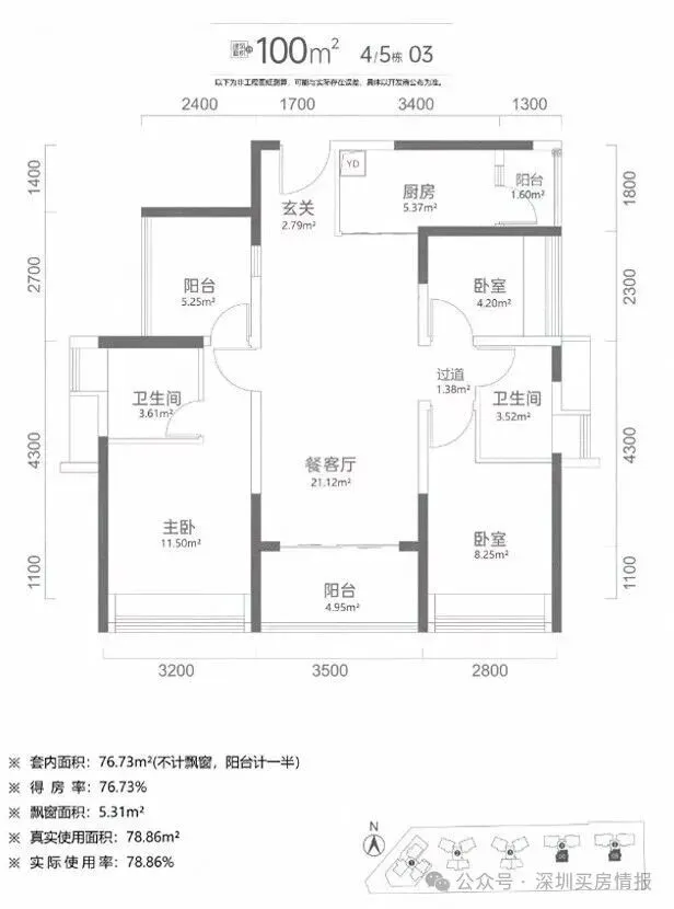 100平米3+1房二卫:双龙抱珠设计在乎玄学的是潮汕人特别喜欢的户型之一;这种户型设计很合理,卧室在客厅的两边,卫生间的布局也很科学,减少了过道,空间利用率特别高。主卧不包括卫生间大小为11.5平米,比较适中,不过朝东的卧室只有4平米左右,做成卧室稍小,比较适合做成书房或者储藏室;这个户型的厨房利用空间大很多,还带有一个生活阳台。