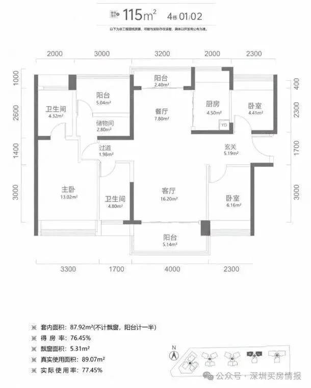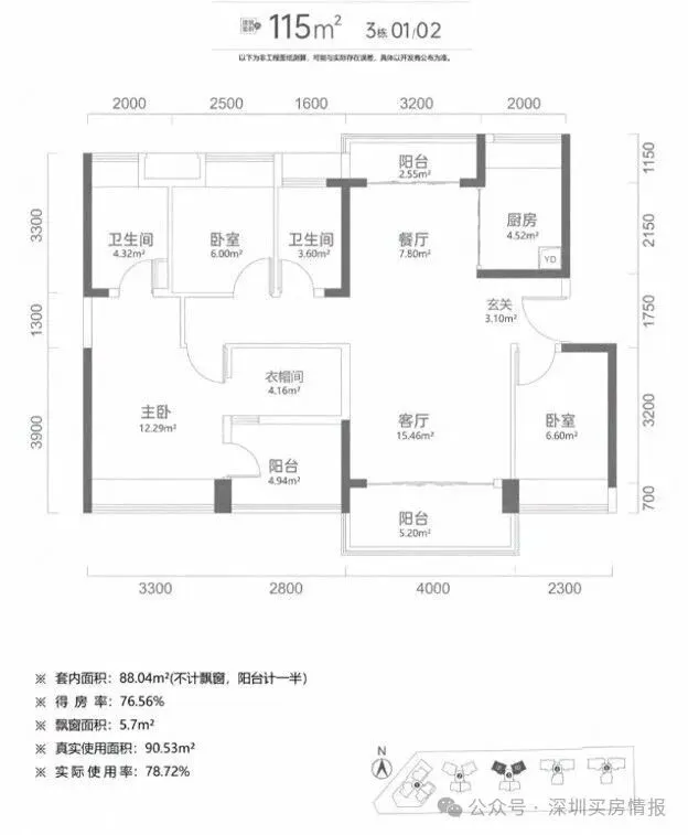 建面115平米:4房2卫,这种户型有3种朝向,3栋01户型西南/东北通透主阳台朝西南,3栋02户型东南/西北通透主阳台朝东南,4栋01/02户型南/北通透户型阳台朝南;