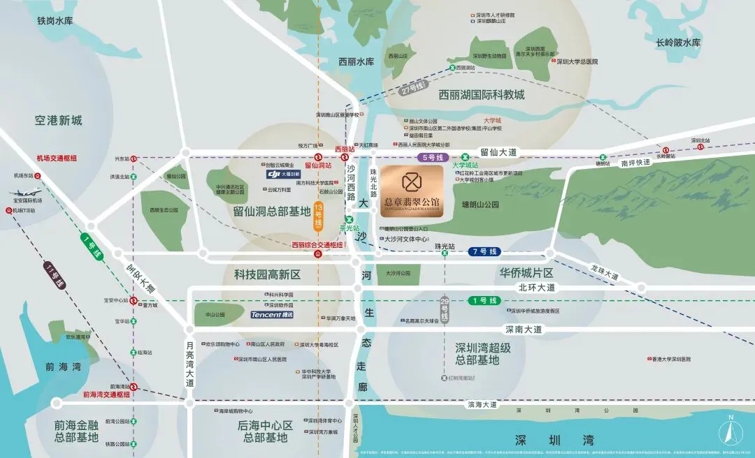 ②1枢纽:毗邻西丽综合交通枢纽(规划中),多地铁线路无缝接驳西丽综合交通枢纽,高效出行畅达全国。③多路网:4纵5横路网,紧邻沙河西路、留仙大道、南坪快速、北环大道等,转瞬辐射全深圳。①城市瞰台:背靠约15000亩塘朗山脉,远眺香港,近瞰西丽水库、福田、南山、前海等地。茶余饭后,或短途漫步,或登山健身,享受富含负氧离子的沁爽。②臻美水岸:毗邻深圳版“塞纳河”——约13.7km大沙河生态走廊,信步深圳最大滨水慢行系统,或沿河漫步、骑行,或静坐垂钓,自然融入生活日常,享受那份远离喧嚣的宁静①文体休闲:项目距大沙河文体中心(在建中2026年营业)直线约740米