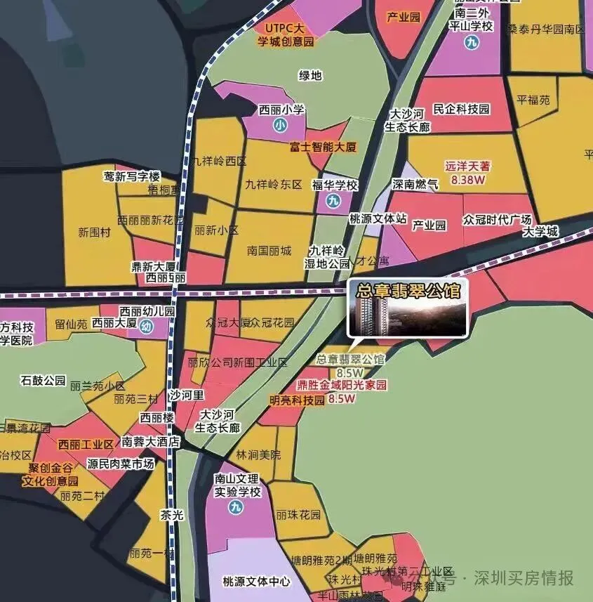 总章翡翠公馆项目位于南山区西丽留仙大道与珠光北路交汇处南侧,项目占地约1.28万㎡、总建筑面积约8.18万㎡,主要由5栋31-32层高住宅塔楼及商业配套组成,建筑呈“一”字摆开型位置上,项目东面触及塘朗山山麓,西面紧邻珠光北路,一路之隔是大沙河生态走廊,周边大的生态环境好。西丽片区,整体生态的底子确实很好的。另外,项目北面是待建住宅用地,以及大学城创客小镇;