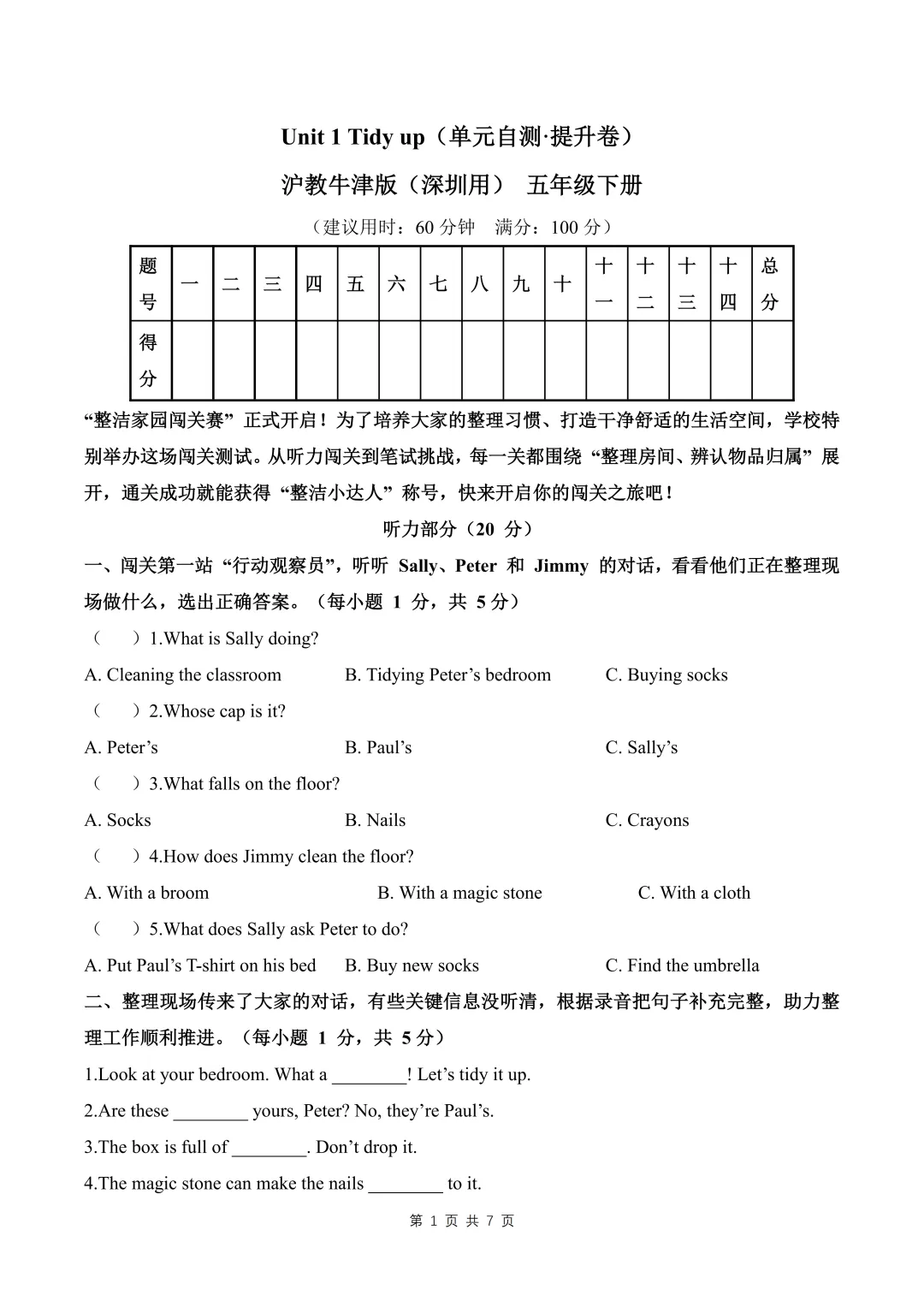 深圳3-6年级下学期英语第一单元检测卷(基础卷+提升卷)
