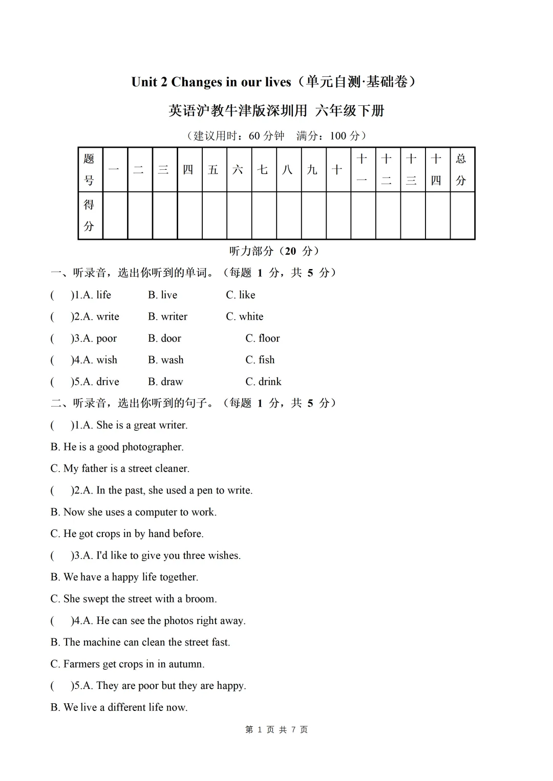 Unit 2 Changes in our lives (单元自测·基础卷)