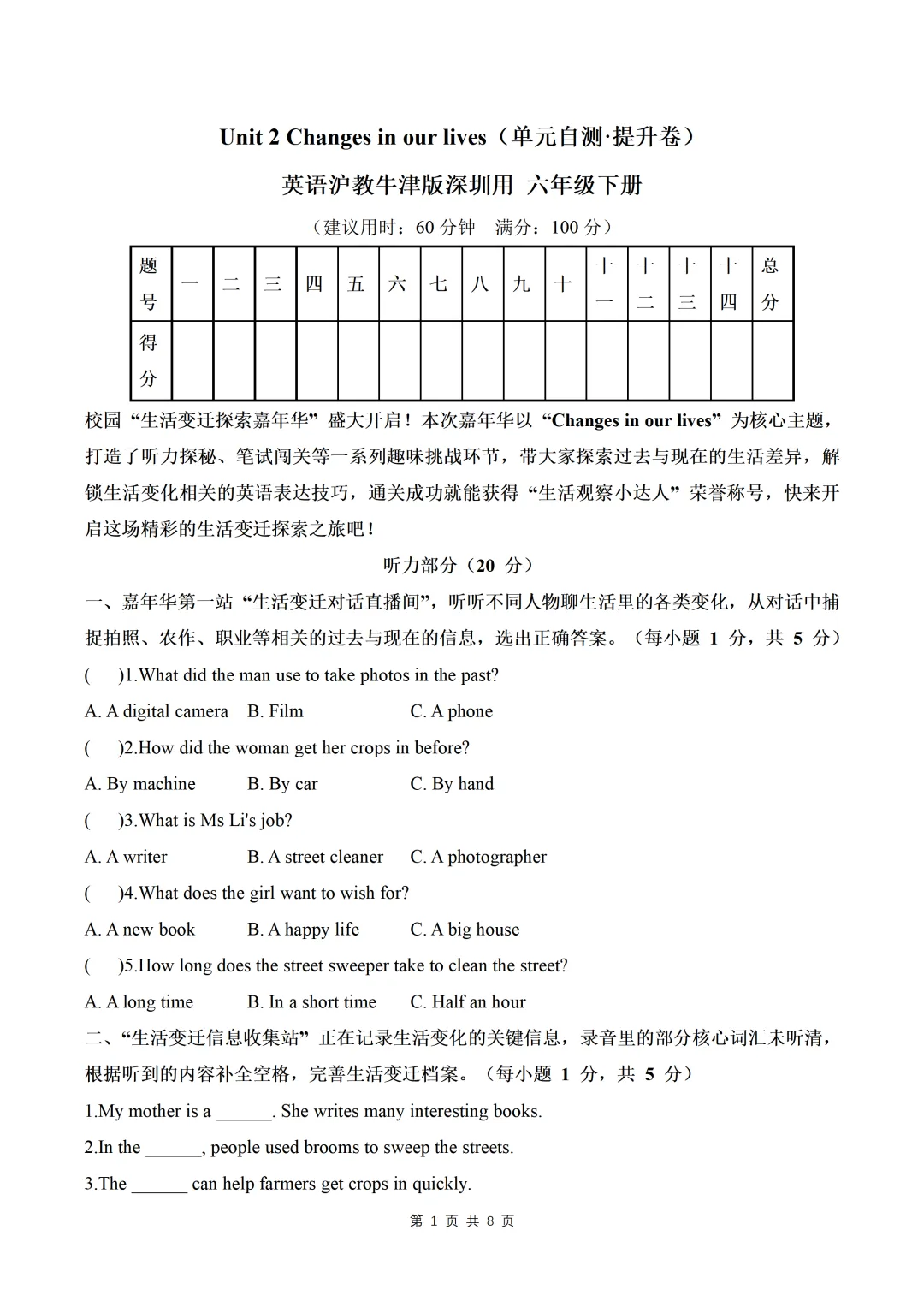 Unit 2 Changes in our lives (单元自测·提升卷)