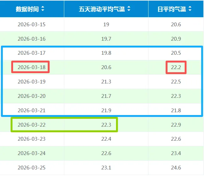 根据四季划分标准,当五天滑动平均气温稳定大于等于22℃,从满足条件的五天中,第一个日平均气温22℃那天起就算入夏。