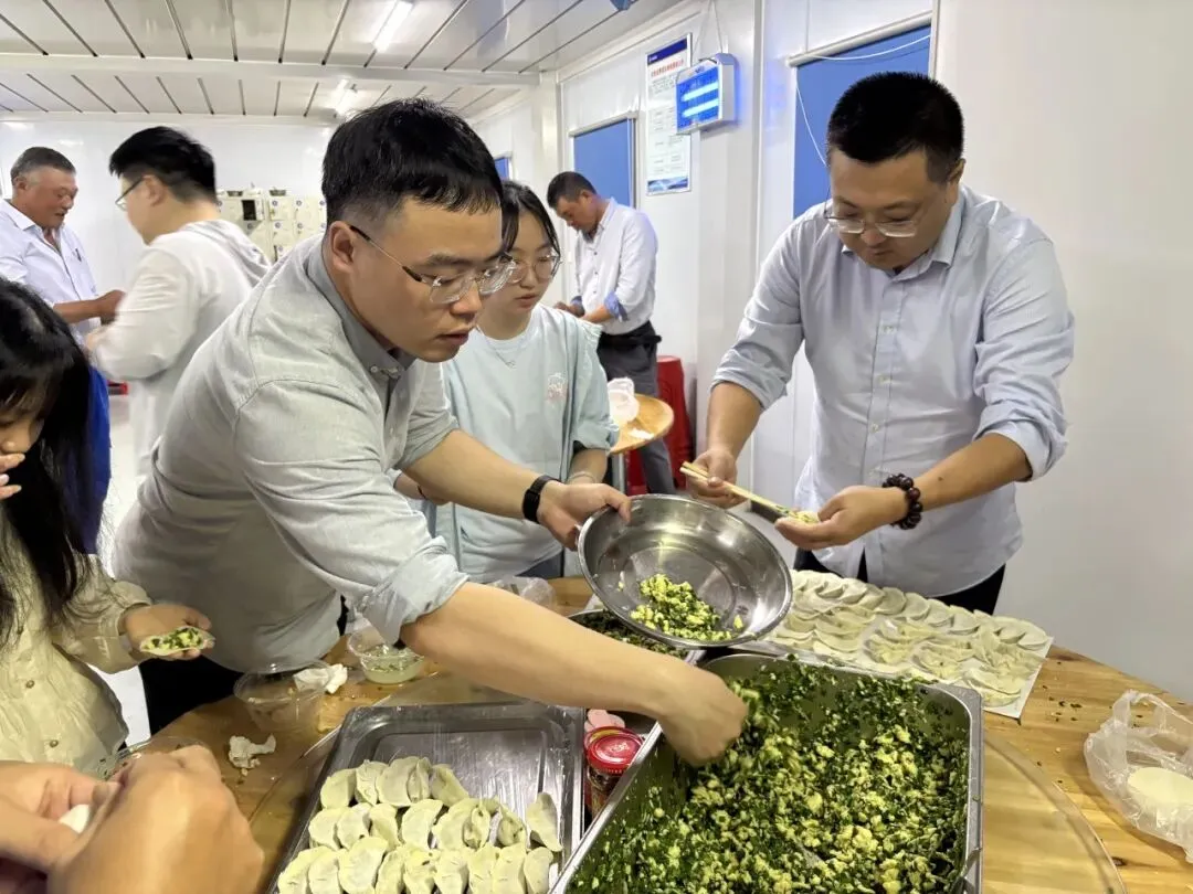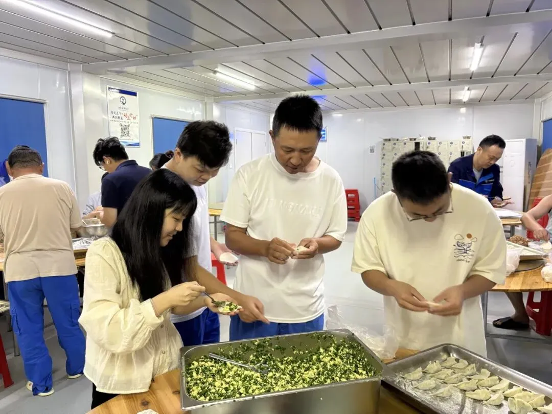 项目部提前备足饺子皮,并精心准备了芹菜猪肉与韭菜鸡蛋两种经典馅料,以满足不同员工的口味需求。活动现场,大家齐聚一堂,话家常、聊工作,氛围轻松而愉悦。期间,员工们还自发组织了包饺子比赛,将气氛推向高潮。新入职员工胡心怡开心的说:“第一次在项目上和同事包饺子特别有意义,师傅们手把手教我捏褶,感觉就像一家人。”
