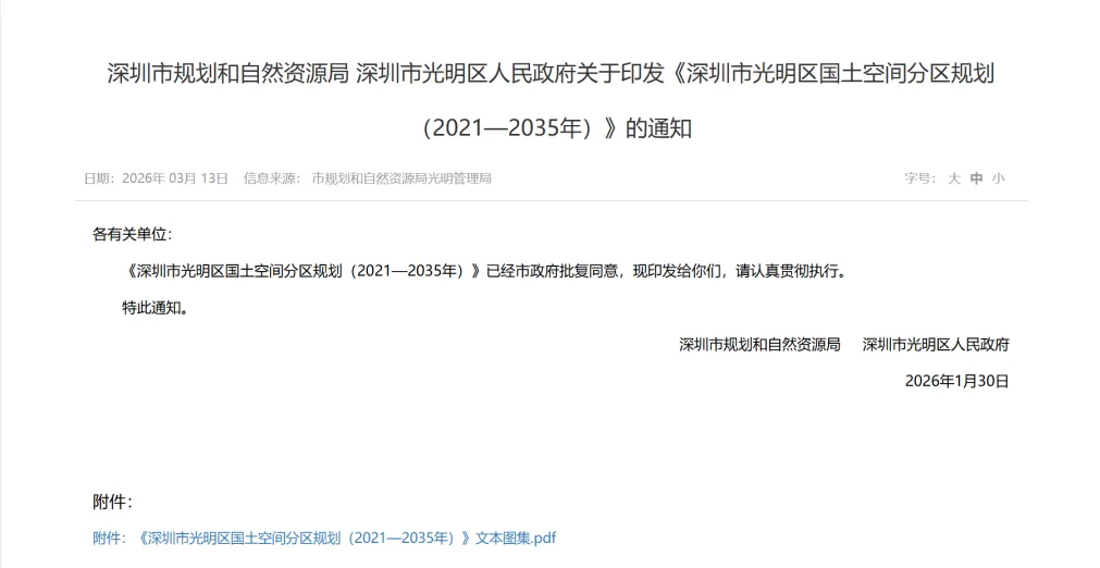 奥一新闻从光明区政府在线官网获悉,近日,《深圳市光明区国土空间分区规划(2021—2035年)》(以下称“规划”)已经深圳市政府批复同意,深圳市规划和自然资源局、深圳市光明区人民政府发布公示。