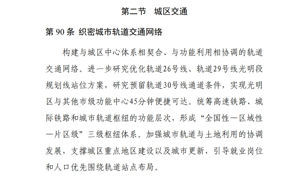 “规划”中提到,构建与城区中心体系相契合、与功能利用相协调的轨道交通网络。进一步研究优化轨道26号线、轨道29号线光明段规划线站位方案,研究预留轨道30号线通道条件,实现光明区与其他市级功能中心45分钟便捷可达。