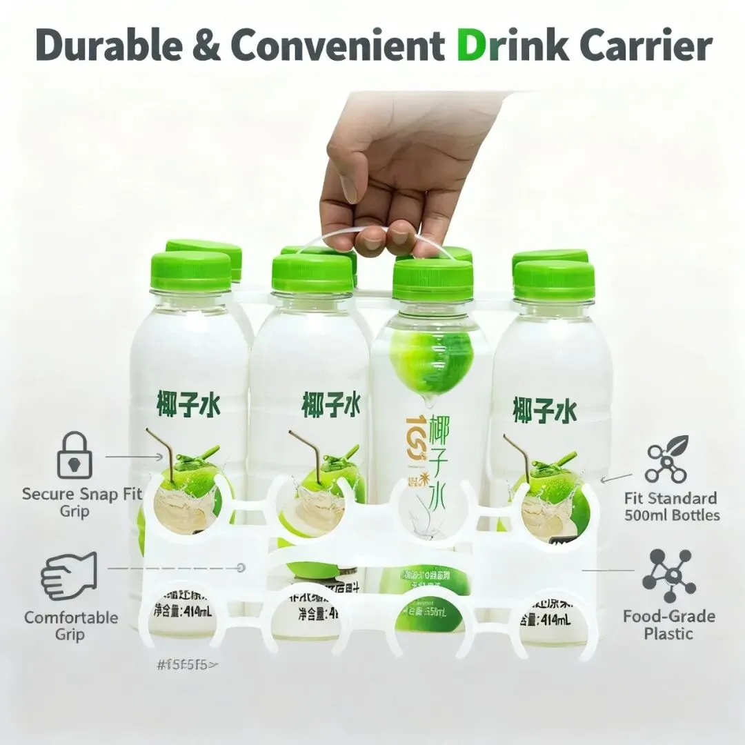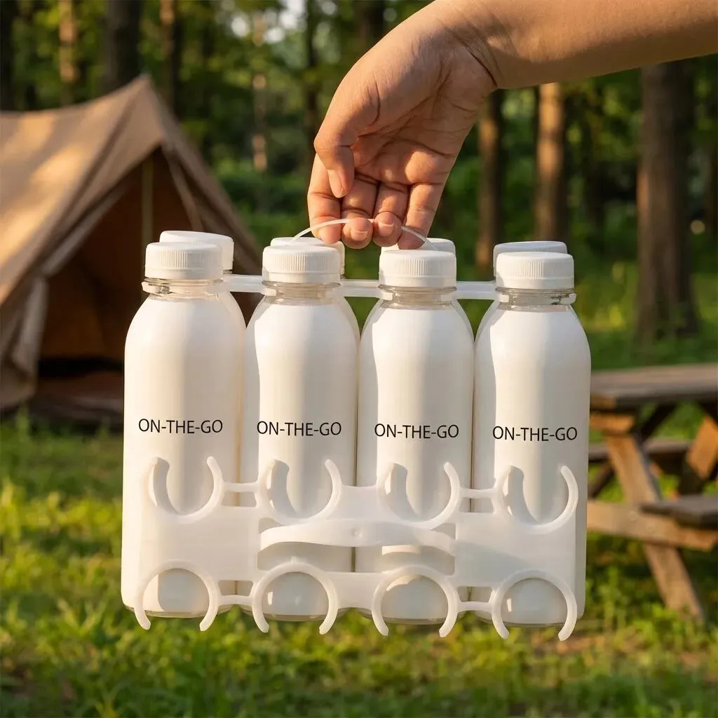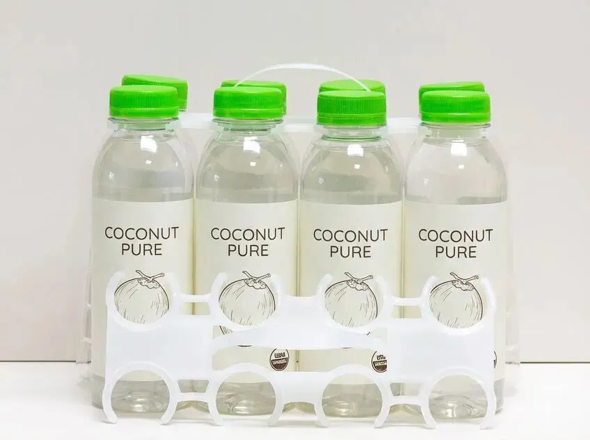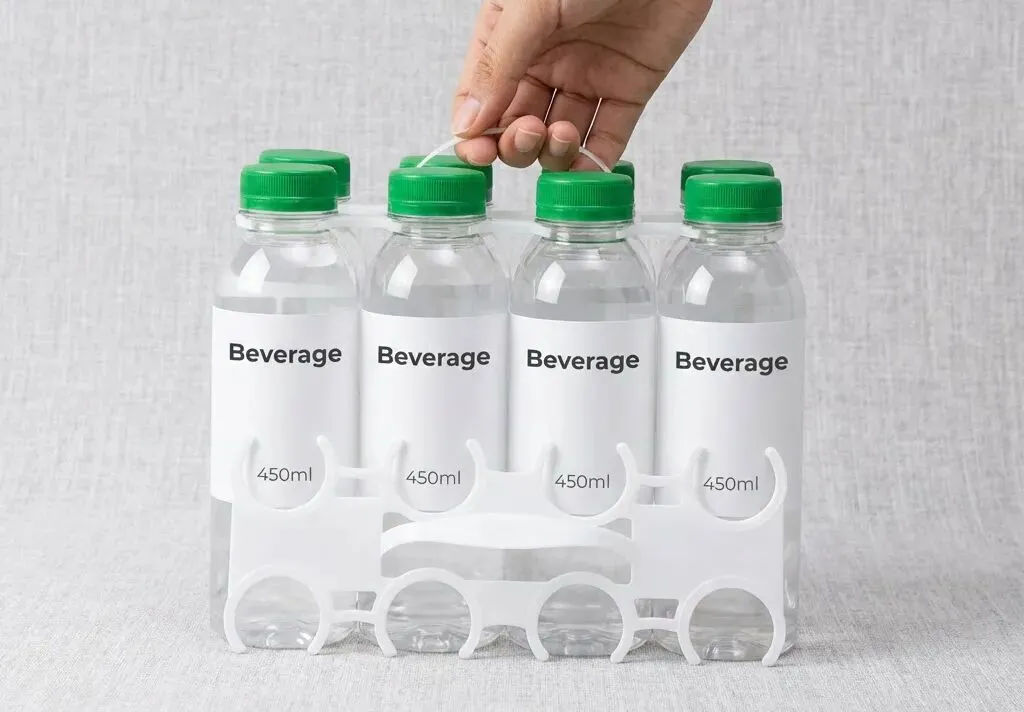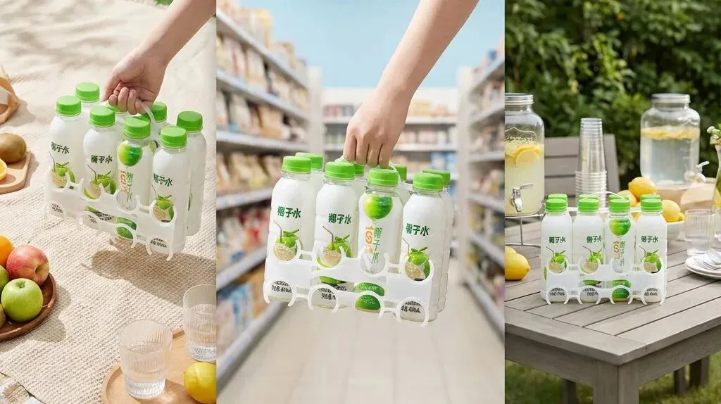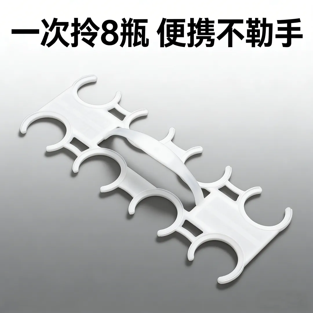 饮料瓶的口径千差万别,从24mm到53mm,鸿源祥都有成熟的单提扣方案。两瓶促销的双提扣,可以根据调味品、饮料、矿泉水不同瓶型精准匹配孔间距。三瓶、四瓶、六瓶、八瓶的多联提手,从PET瓶到玻璃瓶,从易拉罐到食用油桶,都有对应的解决方案。
