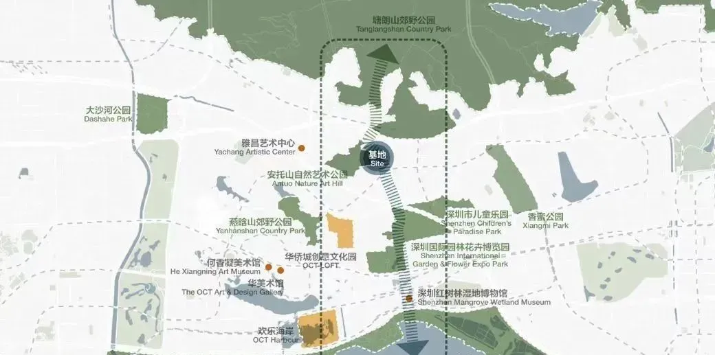 项目地址位于深圳市南山区桃源北环大道北侧塘朗山南麓,邻近深云地铁站。项目大体被山体包裹,西侧和南侧分别临近南坪快速路、北环大道两条城市快速路,其东侧还将建设侨城东路北沿线(建设中),所处片区相对割裂存在。