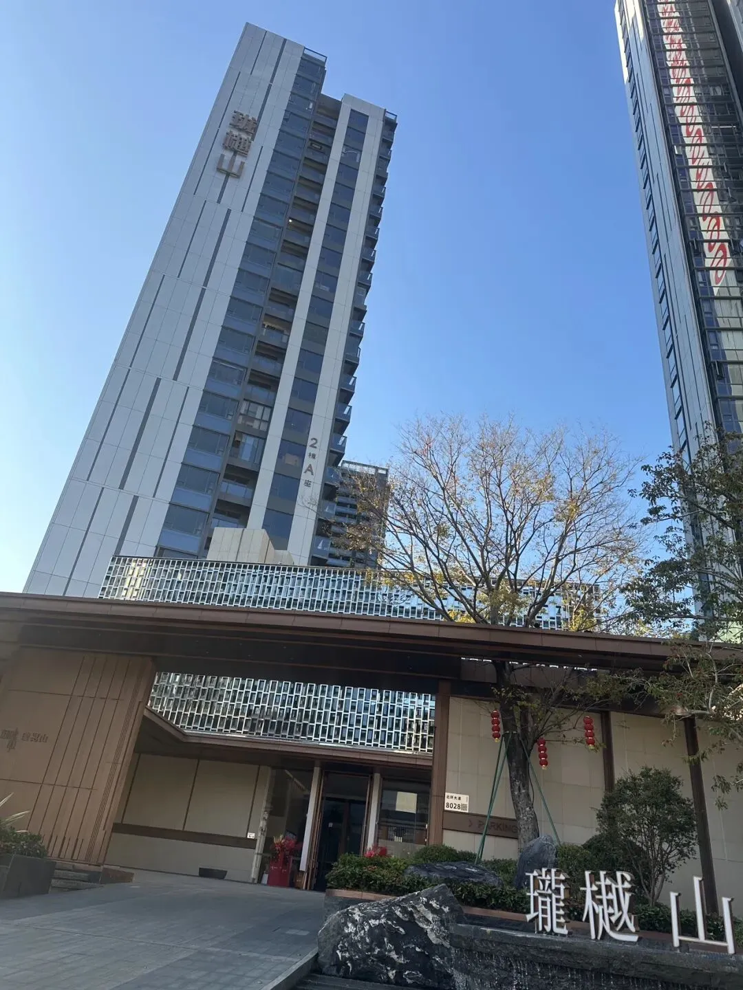 小区是往现代高端社区方向打造,步行大门是山林水石设计,而车行出入口则设计了酒店级回旋处落客区,跟「胤璞」很像。