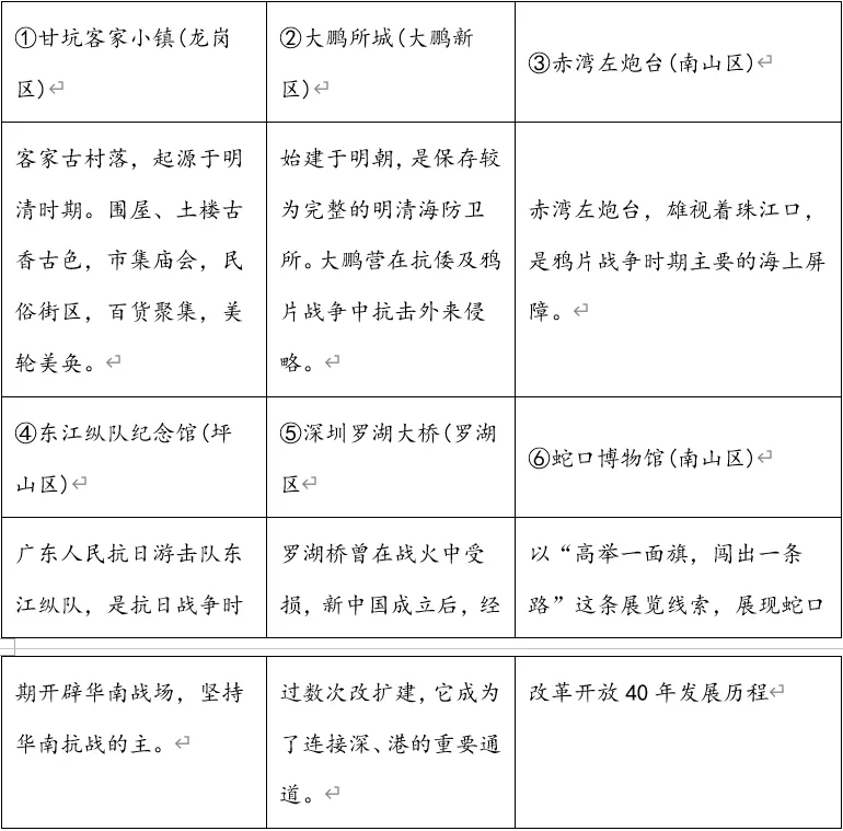 (1)依据上表中的考察地点和所学知识,你能感受到深圳地区人民在发展过程中有哪些优秀品质?