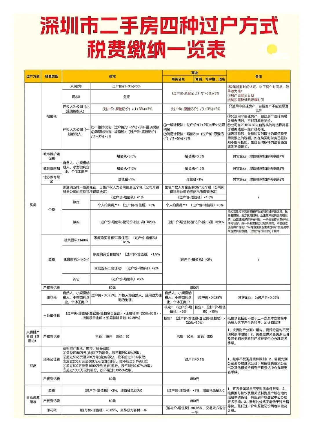 在深圳,不管是市场上买二手房,还是家庭内部的房产流转,过户方式的选择,直接关系到几万甚至几十万的税费成本,差一个选择,可能就多花一笔冤枉钱。今天我们就把深圳二手房最主流的四种过户方式——买卖、夫妻财产分割、继承、直系亲属赠与,从税费规则、适用场景、隐藏风险,给大家讲得明明白白,帮你找到最适合自己的方案。