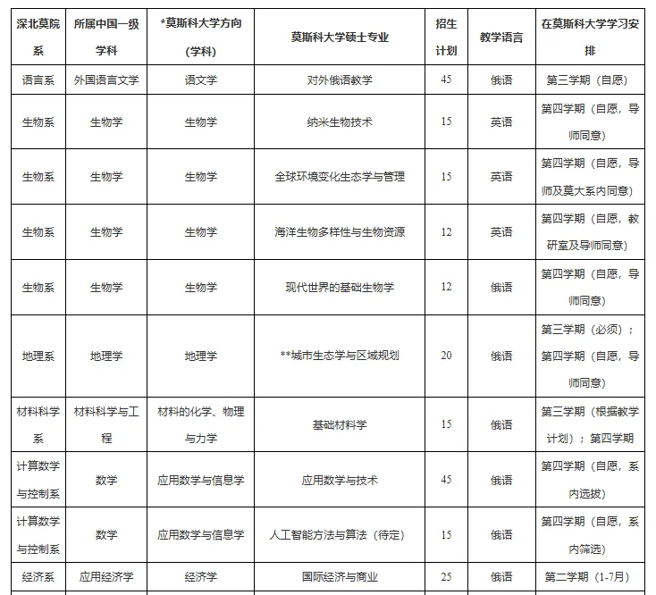 5. 标注** 的2个专业,2026年亦招收优秀的非俄语生,可使用英语参加入学考试,达到入学要求予以录取。入学后注册莫斯科大学学籍,第一学年学习俄语,学籍按休学管理,俄语学习达到B1水平后,恢复学籍,开始学制两年的专业学习(如有疑问,请发送邮件至各系(中心)指定邮箱咨询)。