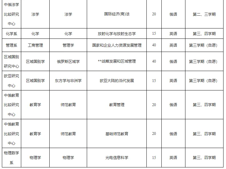 4. 其他。报考城市生态学与区域规划、战略发展和区域管理2个专业的非俄语考生被录取后,第一学年学习俄语,学费为50000元人民币;非中国籍学生在第一学年可自愿申请学习汉语,学费为50000元人民币,学籍按休学管理,第二学年恢复学籍开始专业课学习。住宿费按照本款项第2条标准执行。第二、三年专业学习学费及住宿费按照本款项第1条、第2条标准执行。