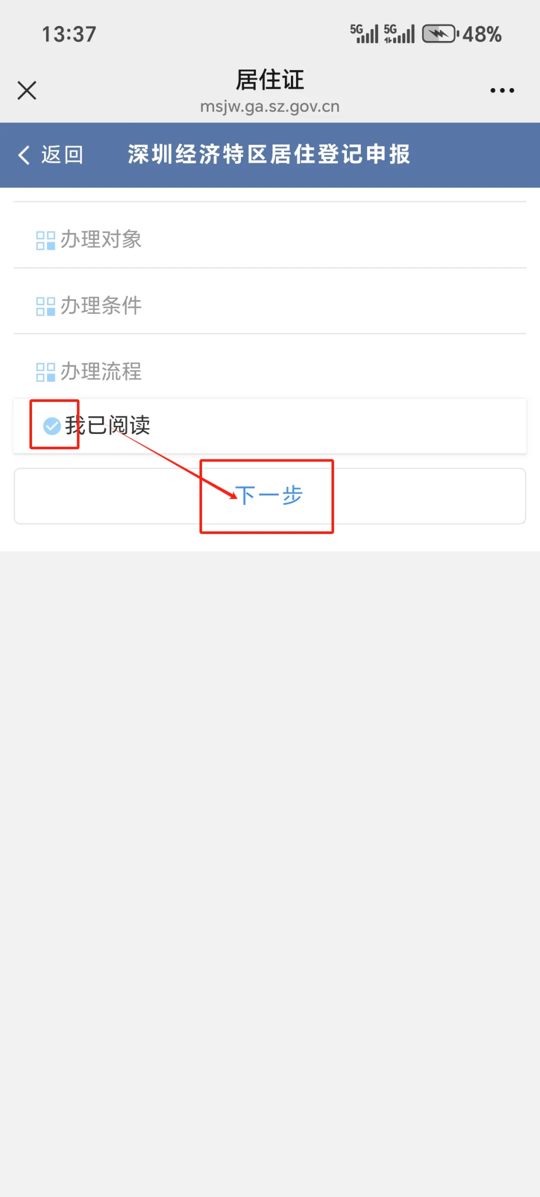 第二步:选择“我已阅读”,点击“下一步”,随后按照要求进行人脸识别认证