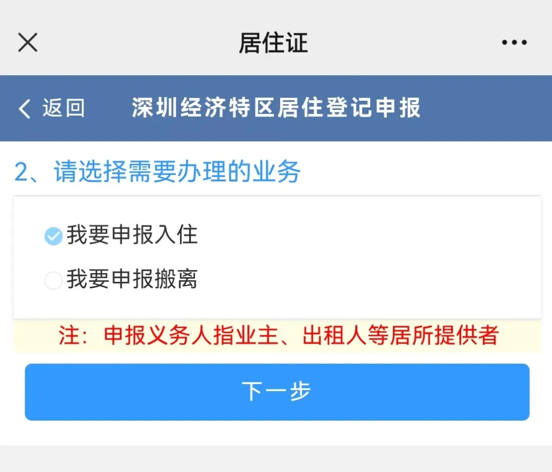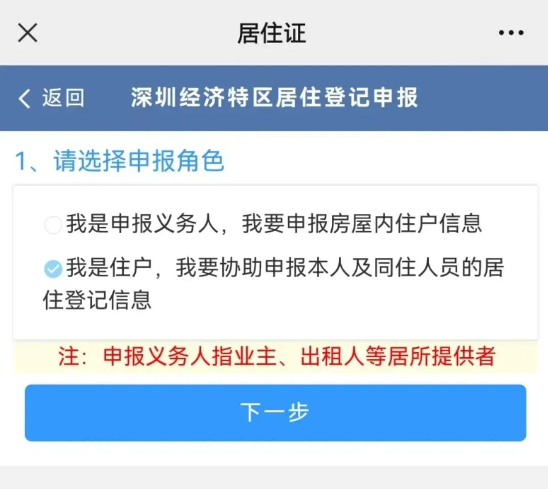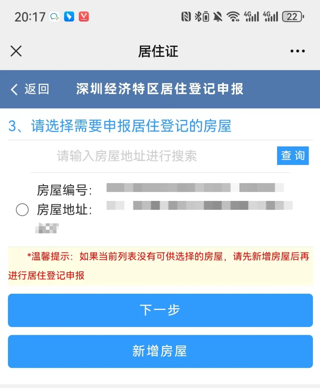 第三步:分别选择“申报角色”—“需要办理的业务”—“申报居住登记的房屋”(此处一般要先提前准备好房屋编码,公众号后台回复“编码”查询自己的房屋编码)