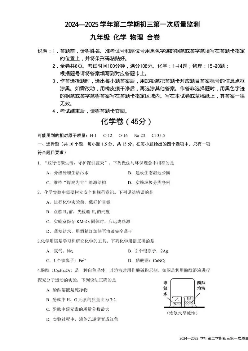 2024-2025学年深圳市南山区育才集团九年级(下)第一次模考化学试卷