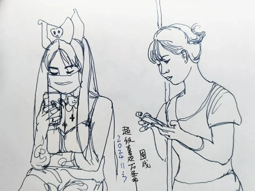 最后,送上一张我在地铁上画的速写——那个低头看手机的人,也许就是你。