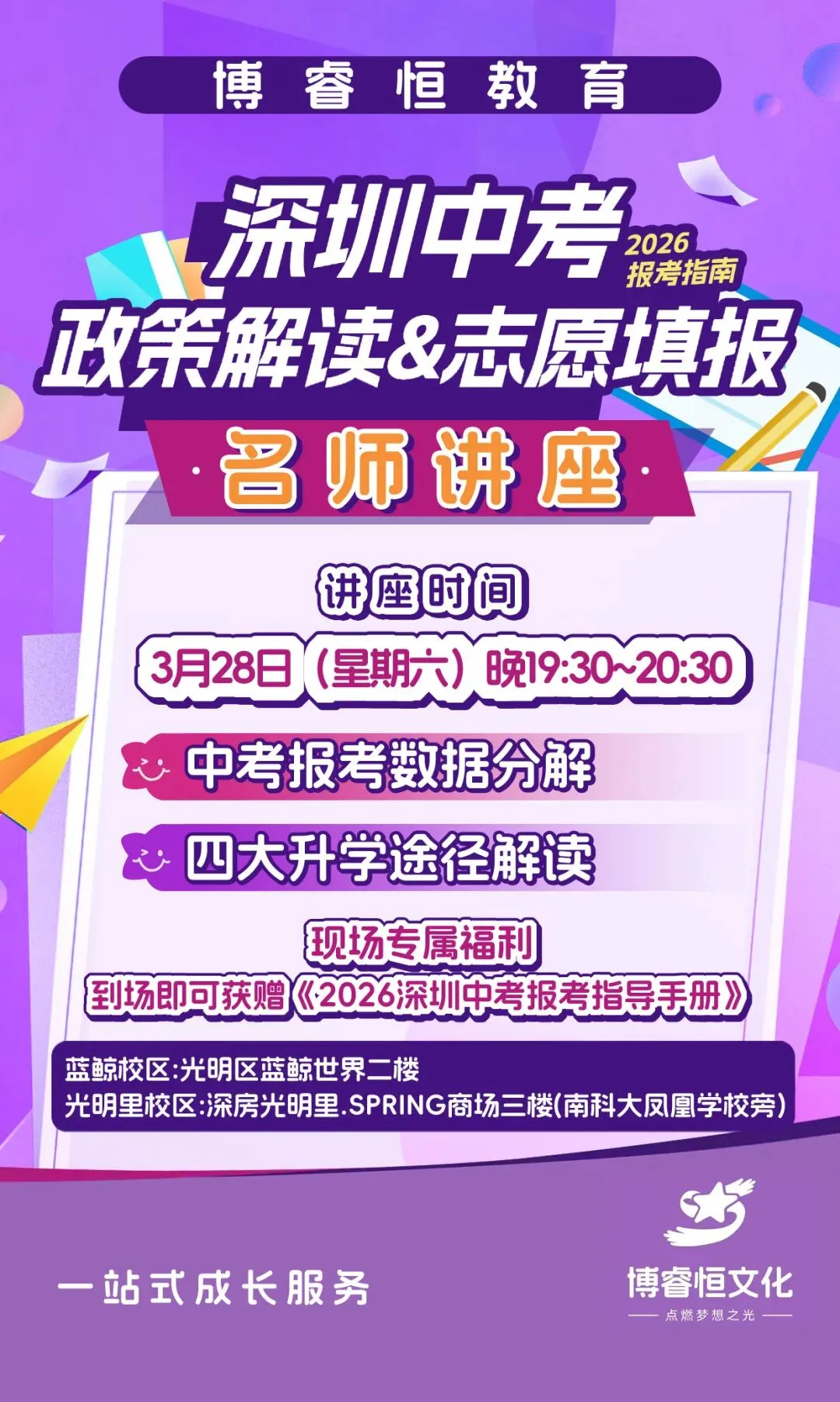 特邀名师带来《深圳中考·志愿填报.四大升学途径深度解读》专场讲座!破局择校困境,凡到场即可获赠《2026深圳中考志报考指导手册》专属福利,活动全程公益高能!