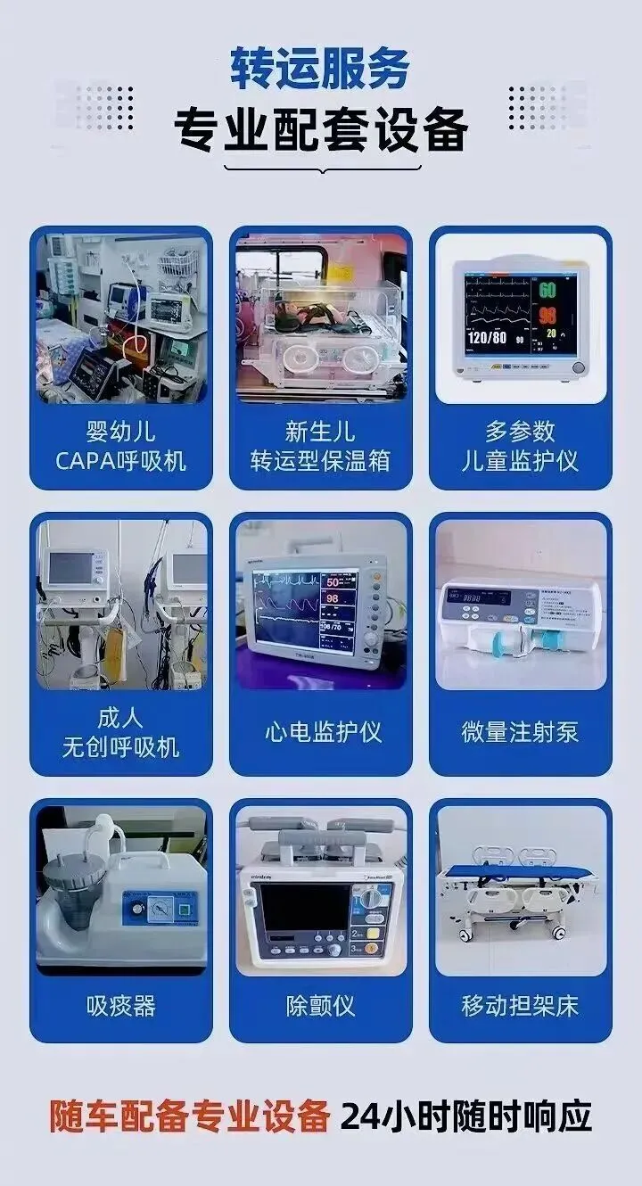 特殊配置:新生婴儿保温箱、无创血压监测仪所有设备均通过国际认证,定期检修校准,满足重症患者长途转运需求。
