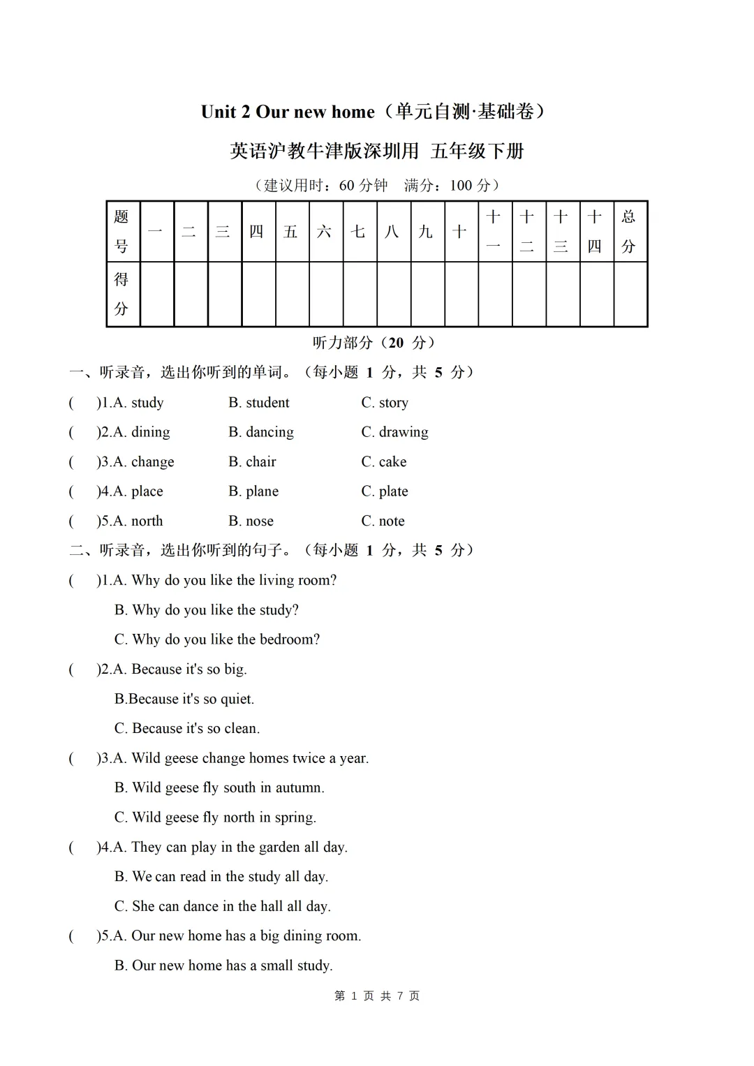 Unit 2 Our new home (单元自测·提升卷)