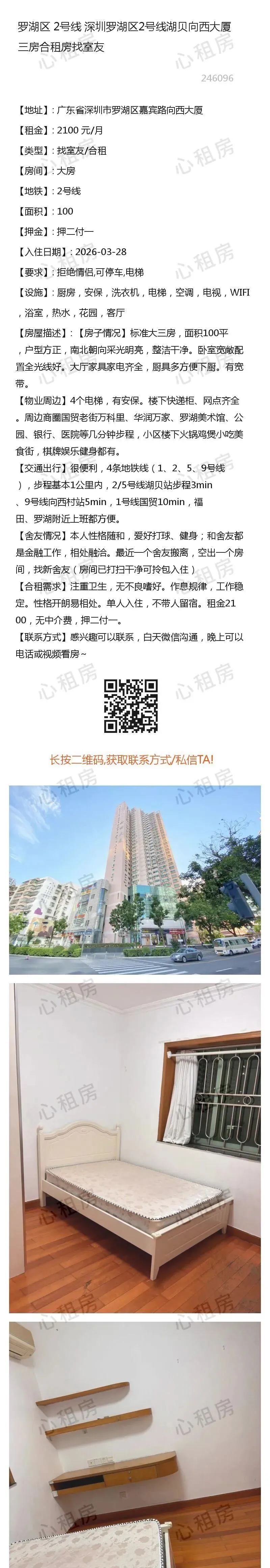 深圳租房【罗湖3则】房源①:2号线深圳罗湖湖贝向西大厦三房合租房找室友2100元/月;房源②:…